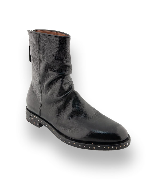 Handgefertigte Boots von Elia Maurizi versprechen enormen Tragekomfort. Schwarzes weiches Leder, hochwertiges Lederfutter und vor allem durch die aufwendige Sacchetto-Machart gewinnt der Bootie an Flexibilität. Nägel, die in die Sohle eingearbeitet sind wirken cool und verpassen der Stiefelette rockige Akzente. Gerafftes Oberleder und der Reißverschluss an der Ferse sind weitere ansprechende Details und höchst Wirkungsvoll. Traumhafte Qualität von Elia Maurizi.