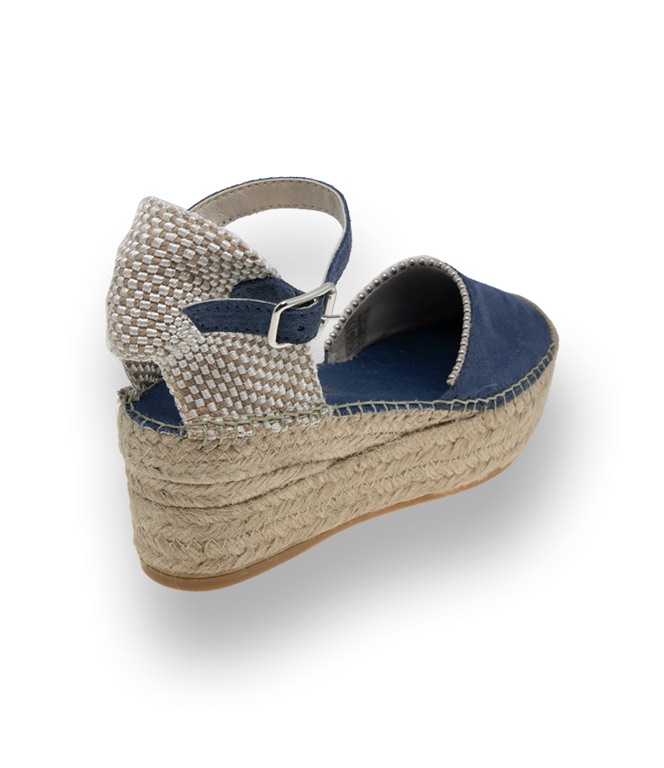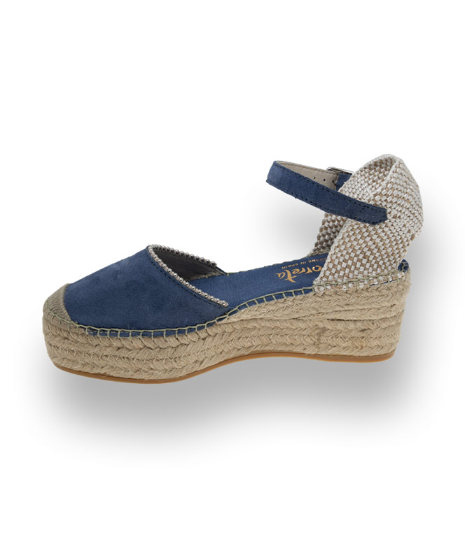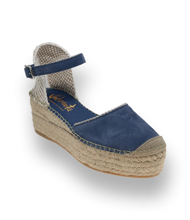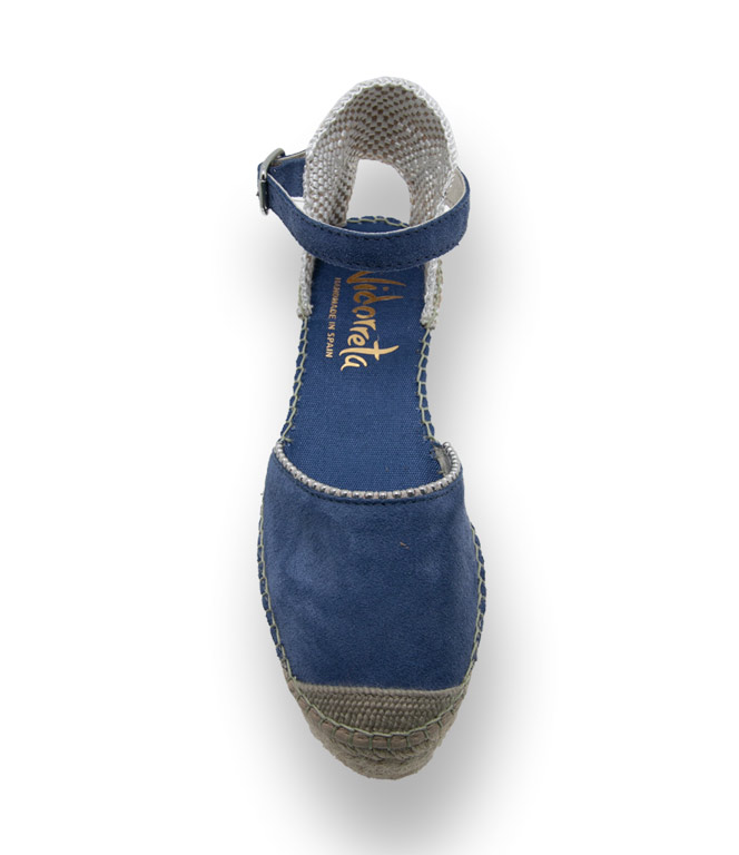 Summertime Epadrilles sind Stimmungsaufheller und wecken Reiselust. Jeansblaues Veloursleder auf einem herrlich bequemen Plateauboden aus Bast in einer Höhe von 3 auf 6cm lässt es sich prima verweilen und vervollständigt ihr sommerliches Outfit. Die silberfarbene Einfassung ist ein verspieltes Detail das Wirkung zeigt. Barfuß hinein in die Espadrilles von Vidoretta. Geeignet für Strand und Stadt. So geht Sommer.