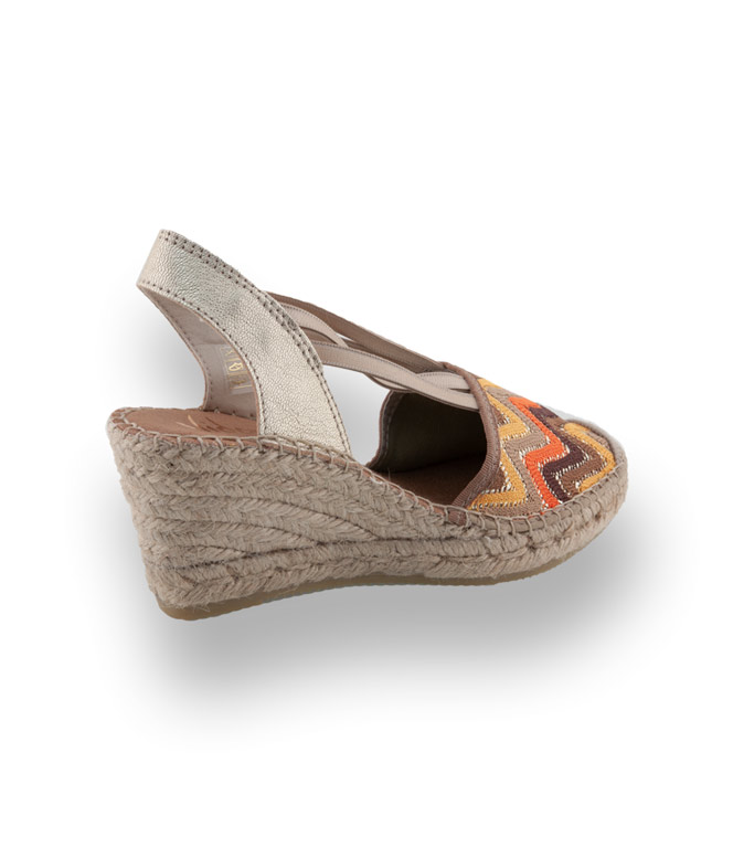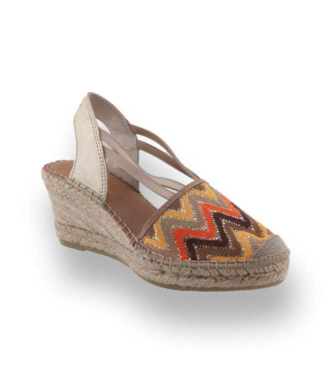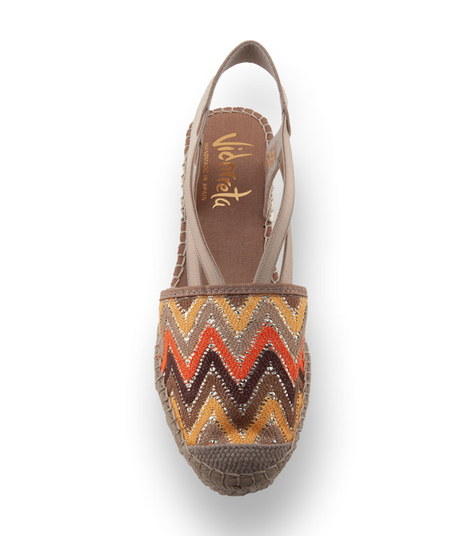Die Temperaturen klettern und barfuß hinein in die schicken Espadrilles von Vidorreta. Zickzackmuster in Häkel-Optik zeigt sich in Gelb, Orange u. Erdtönen und ihr Beach-Look ist perfekt. Fersenriemen aus Metallicleder und durch die angebrachten Elasthanbänder ist der nötige Halt geboten. Der 6cm auf 2cm hohe Keilboden aus Hanf wird mit einer Gummilaufsohle geschützt.