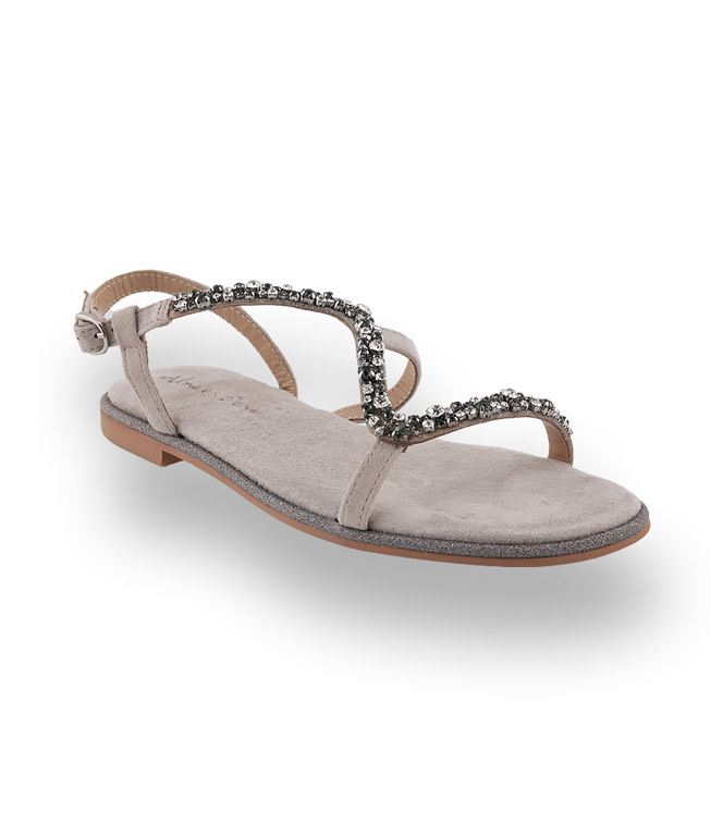 Aus hellgrauen Veloursleder verziert mit Strasssteinchen wird die Sandalette zum idealen Alltagsbegleiter für herrliche Sommertage. Luftig und leicht, hübsche Riemchenanordnung bietet optimalen Halt und eine weichgepolsterte Lederdecksohle garantiert Komfort. Ruf nach Freiheit und Sonne.