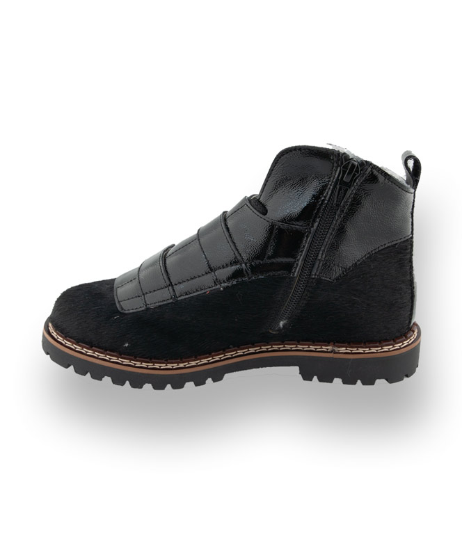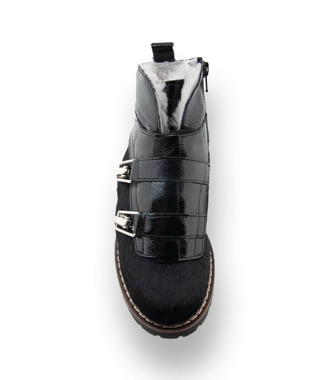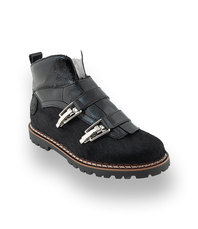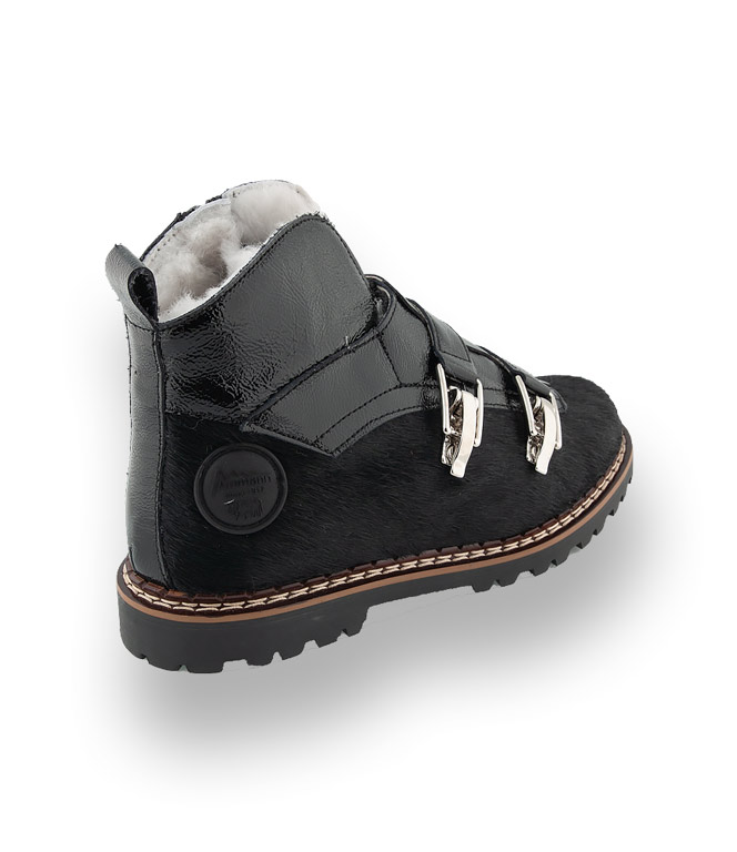 Mit diesem frechen Bootie im Retrostyle werden kalte Wintertage zum Vergnügen. Pflegeleichtes Kuhfell in elegantem schwarz wurde mit Lackleder und edlen silberfarbenen Schnappschließen aufgepeppt. Kuscheliges Lammfellfutter macht Frieren zum Fremdwort und die profilierte Gummilaufsohle bietet Rutschsicherheit. Der sichtbare Rahmen mit den hellen Nähten spricht für die hochwertige Verarbeitung.