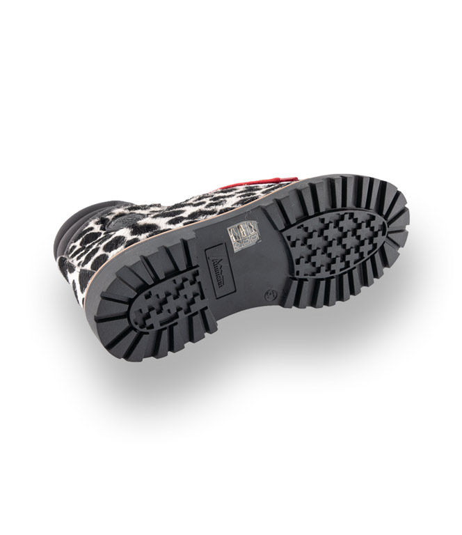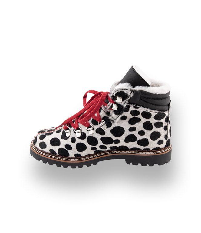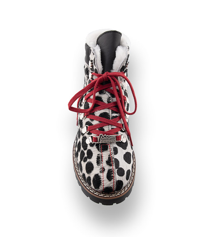 Man hat lange viel Freude mit diesen Schuhen und vor allem immer warme Füße. Ammann macht aus dem klassischen Bergsteiger ein Fashion-Highlight. Eingefärbtes Kuhfell im Dalmatinerprint. Edle Ösen, das Schildchen mit Designerlabel und die legendären roten Schuhbänder sorgen für Aufsehen. Kuscheliges Lammfellfutter verwöhnt ihre Füße und macht Frieren zum Fremdwort. Die hochwertige, profilierte Gummilaufsohle garantiert ihnen Trittsicherheit.