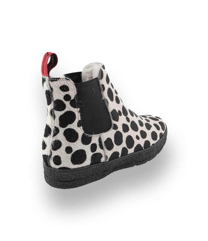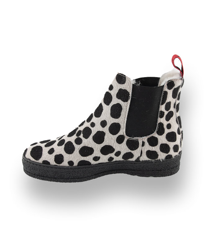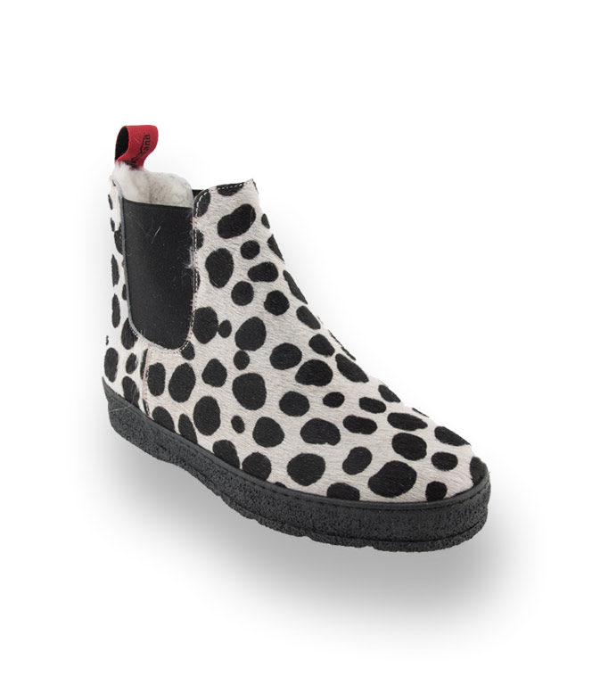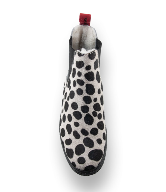Nein mutiger Mustermix, Material-Experiment und erlaubt ist was gefällt. Derbe Chelseas im individuellen Design von Ammann. schwarz- weißes eingefärbtes Kuhfell im Dalmatinerprint. Lammfellfutter und beste Materialien zeichnen einen Ammann - Schuh aus. Die Curling Gummisohle hat ein spezielles Winterprofil mit einer maximalen Auflagefläche für sehr guten Griff auf Schnee und Eis.