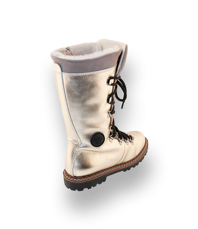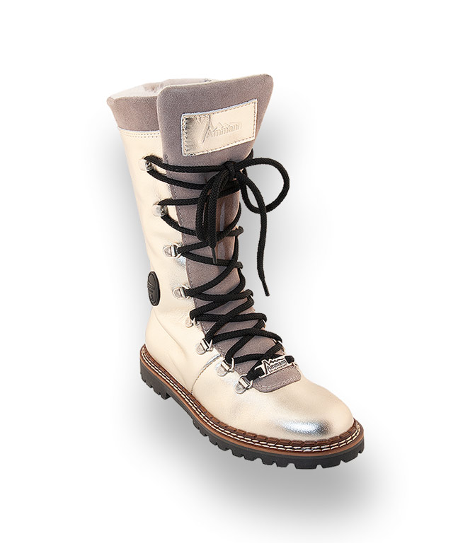 Ammann verpasst dem traditionellen Look ein neues Gesicht. Kalbsleder in goldfarben-metallic kombiniert mit taupefarbenem Velour lässt sie topmodisch und bequem in die neue Saison starten. Mit der kuscheligen Lammfellfütterung wird Frieren zum Fremdwort. Metallicfarbene Ösen, das Schildchen mit Designerlabel und die schwarzen Schuhbänder runden das Gesamtbild harmonisch ab. Langeweile war gestern - dieser Stiefel macht einfach gute Laune. Dank des seitlichen Reißverschlusses muss die Schnürung nur beim 1. Mal angepasst werden. Die hochwertig verarbeitete, profilierte Gummilaufsohle sorgt für absolute Rutschsicherheit.