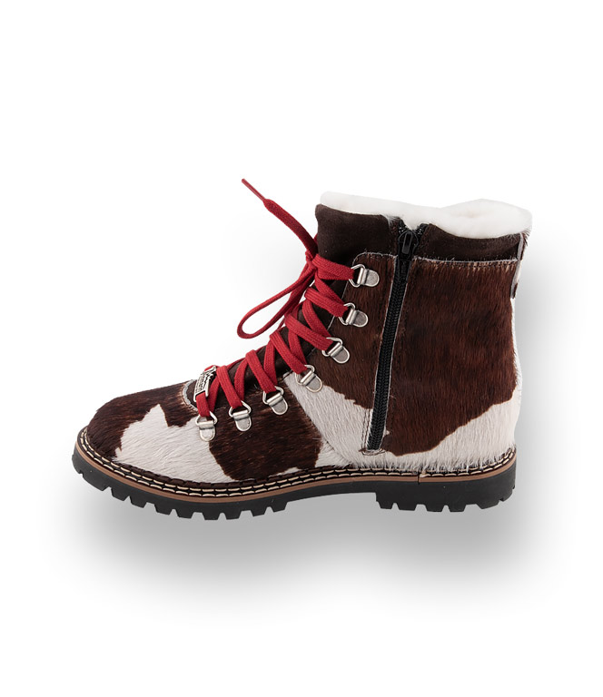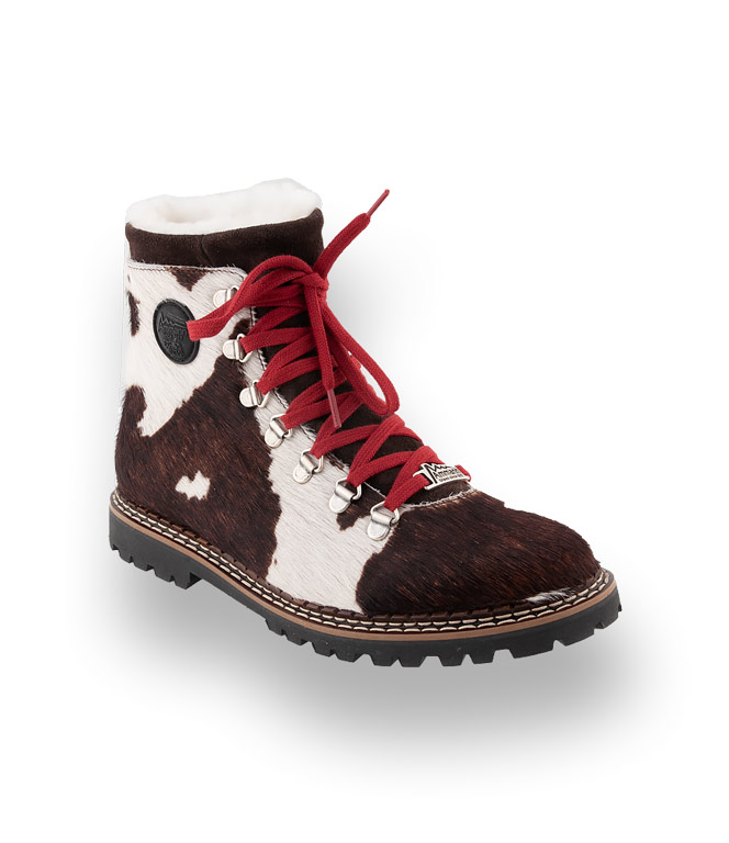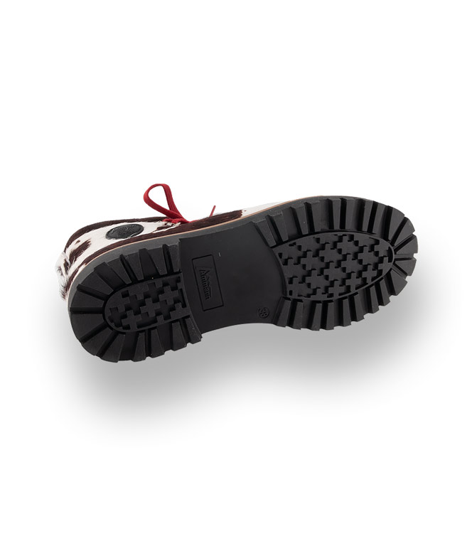 Ammann macht aus dem traditionellen Bergsteiger ein Fashion-Highlight. Kuhfell in braun weiß bedruckt. Edle Ösen und das kleine Schild mit Designerlabel sind ein Markenzeichen des Schweizer Traditionsunternehmens. Die legendären roten Schuhbänder und die Ziernähte runden das Gesamtbild harmonisch ab. Kuscheliges Lammfellfutter macht Frieren zum Fremdwort. Für Trittsicherheit sorgt die hochwertige, profilierte Gummilaufsohle. Dieser Schnürstiefel lässt sie graue Wintertage vergessen und überall gut ankommen.