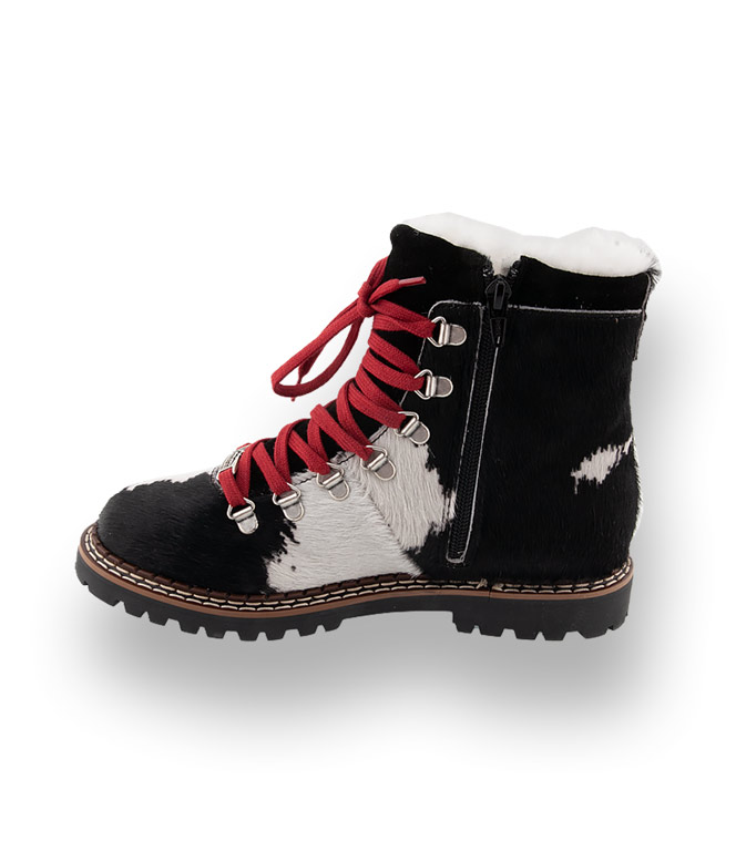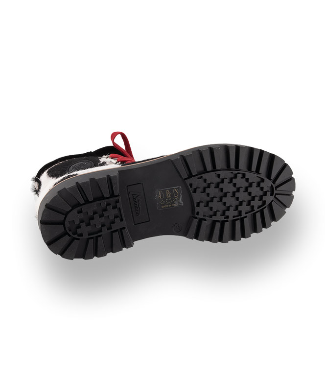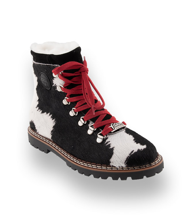 Ammann macht aus dem traditionellen Bergsteiger ein Fashion-Highlight. Kuhfell in schwarz weiß bedruckt. Edle Ösen und das kleine Schild mit Designerlabel sind ein Markenzeichen des Schweizer Traditionsunternehmens. Die legendären roten Schuhbänder und die Ziernähte runden das Gesamtbild harmonisch ab. Kuscheliges Lammfellfutter macht Frieren zum Fremdwort. Für Trittsicherheit sorgt die hochwertige, profilierte Gummilaufsohle. Dieser Schnürstiefel lässt sie graue Wintertage vergessen und überall gut ankommen.