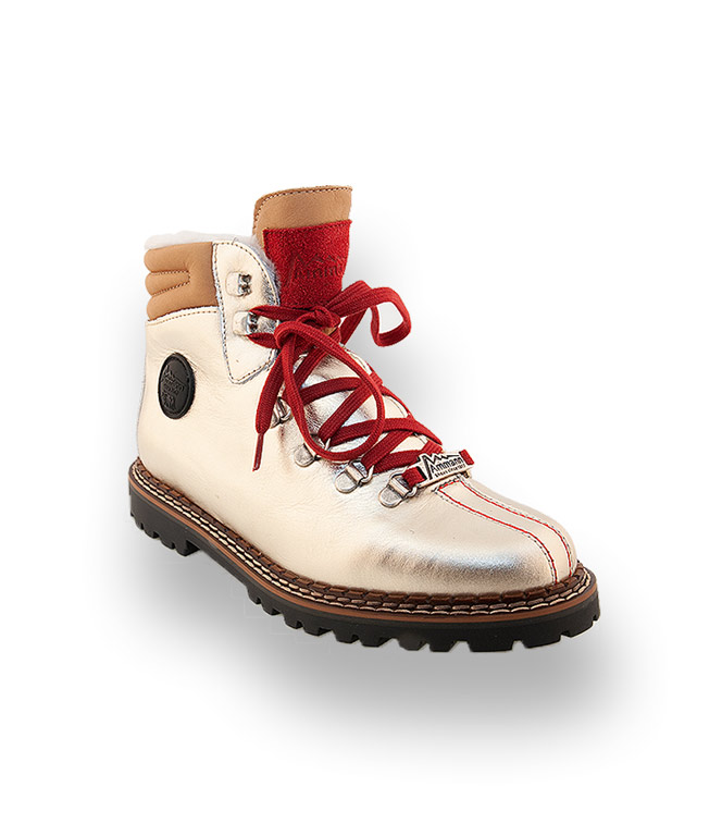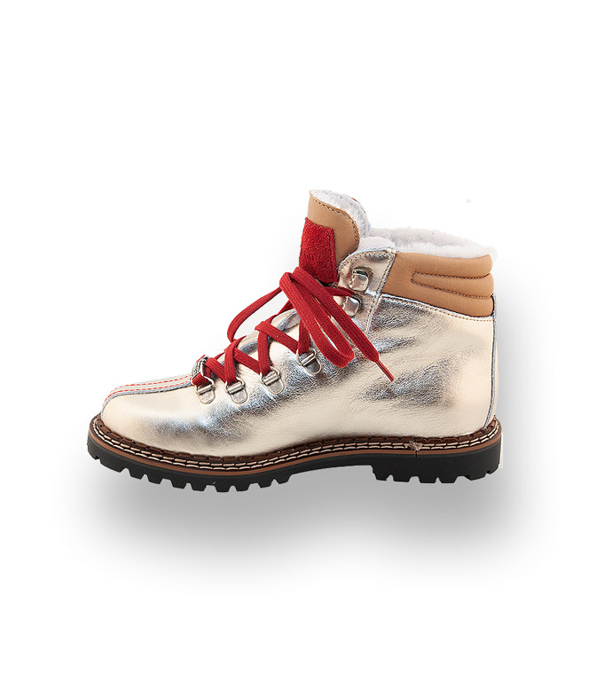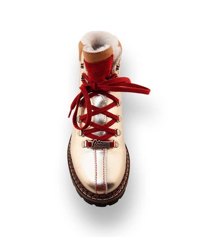 Metallicfarbenes Kalbsleder wurde mit hellem Glattleder gekonnt ergänzt. Edle Ösen und das kleine Schild mit Designerlabel sind ein Markenzeichen des Schweizer Traditionsunternehmens. Rotes Velourleder an der Zunge, die legendären roten Schuhbänder und die Ziernähte runden das Gesamtbild harmonisch ab. Kuscheliges Lammfellfutter macht Frieren zum Fremdwort. Für Trittsicherheit sorgt die hochwertige, profilierte Gummilaufsohle. Der glänzende Schnürstiefel lässt sie graue Wintertage vergessen und überall gut ankommen.