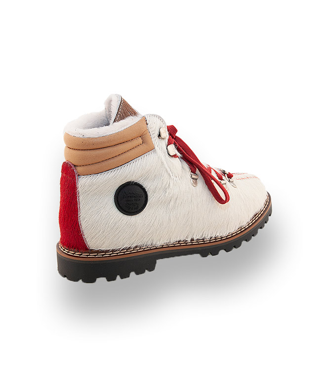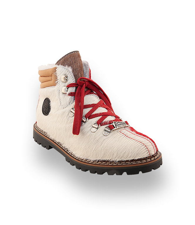 Man hat lange viel Freude mit diesen Schuhen und vor allem immer warme Füße Tipp - eine warme Einlagesohle macht die Stiefel noch kuscheliger. Die Modelle fallen klein aus bitte eine Nummer größer bestellen. Bei diesem Bergsteiger ist gute Laune vorprogrammiert. Unempfindliches eingefärbtes Kuhfell in rot und weiß lässt sie graue Wintertage vergessen. Ammann macht den Klassiker zum Fashion-Highlight. Der helle Lederabschluss und die naturbelassene Fellzunge sind ein weiterer Hingucker. Edle Ösen, das kleine Schild mit Designerlabel und die legendären roten Schuhbänder runden das Gesamtbild harmonisch ab. Kuscheliges Lammfellfutter macht Frieren zum Fremdwort. Die hochwertige, profilierte Gummilaufsohle sorgt auf glatten Wegen für Trittsicherheit.