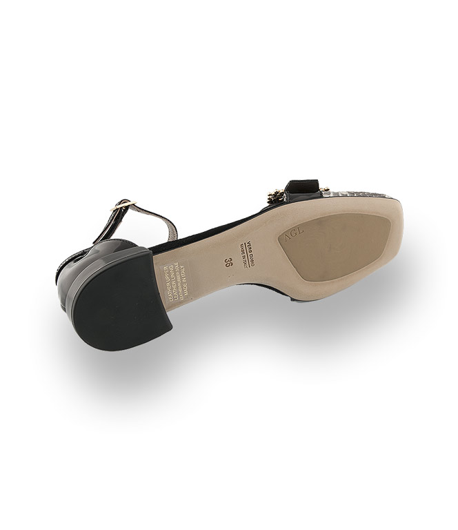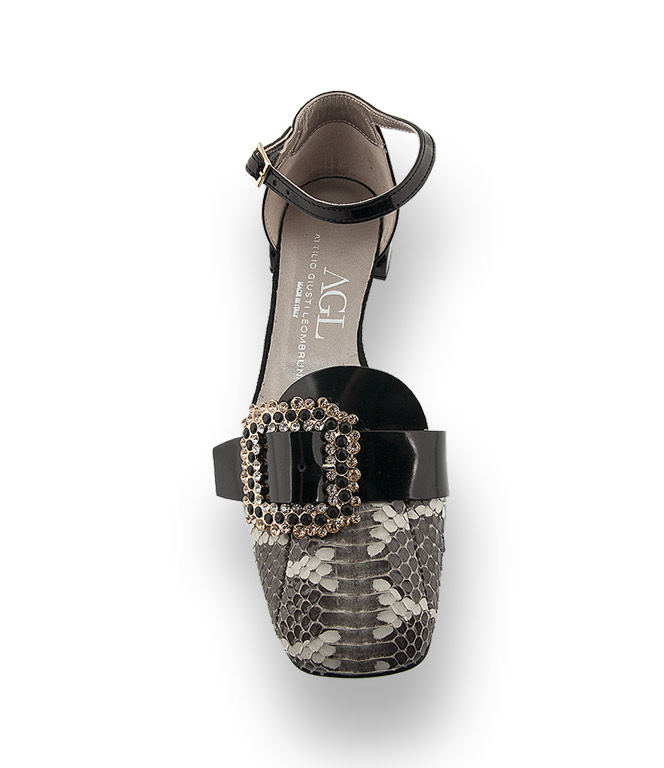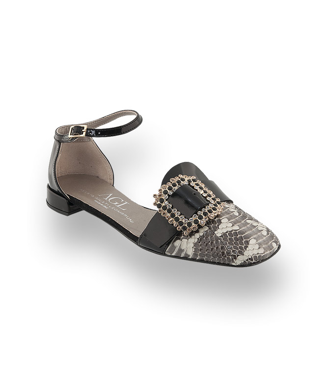 Ballerina's von AGL die ihr Outfit märchenhaft stylen. Python-Print und schwarzes Spazzolato-Leder im modischen Karree wirkt schon außergewöhnlich, aber das Ganze wird noch durch die dekorative Schmuckschnalle getoppt. Hochwertige Verarbeitung, feinstes Lederfutter und eine Lederlaufsohle mit Gummieinsatz begünstigen den Tragekomfort.