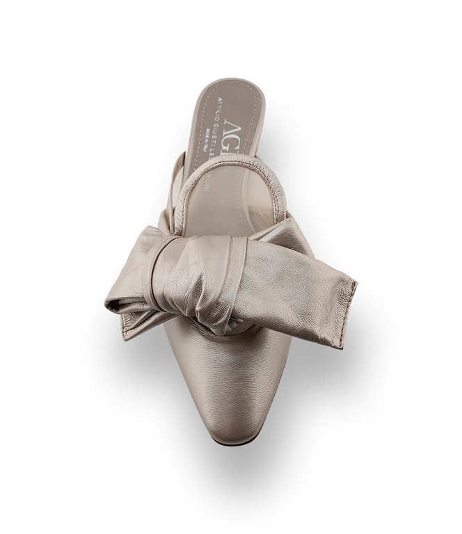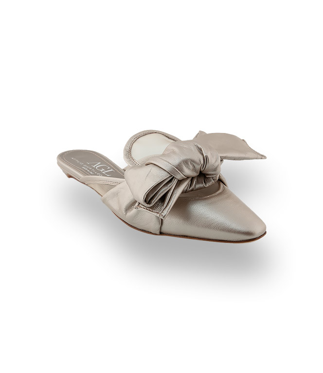 Traumhaftes modisches Zusammenspiel: Platinfarbenes Ziegennappa, übergroße Lederschleife und Transparenz suggerieren Sinnlichkeit. Mode macht Spaß. AGL- Attilio Giusti Leombruni beeindruckt durch Qualität und Design. Schmücken Sie ihr Outfit mit diesem sensationellen Sabot.