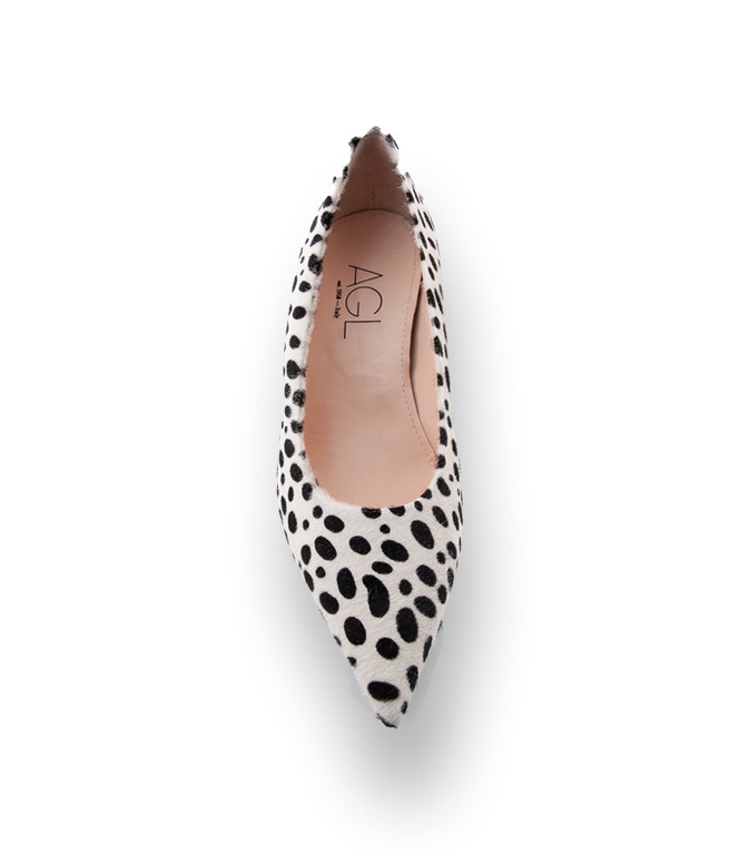 Gönnen Sie sich den weiß/schwarzen Pumps von AGL aus Kalbsfell im Dalmatinerlook. Selbst im 5cm hohen Stilettoabsatz setzt sich der Aufdruck fort. Ein stilvoller, alltagstauglicher Schuh der keine Wünsche offen lässt. Hochwertiges Futterleder und eine Lederlaufsohle mit einem rutschsicheren Gummieinsatz sind wichtige Details die enormen Tragekomfort bieten. Ein Mode-Allrounder steht auf der Wunschliste. Powern Sie mit diesem begehrenswerten Begleiter.