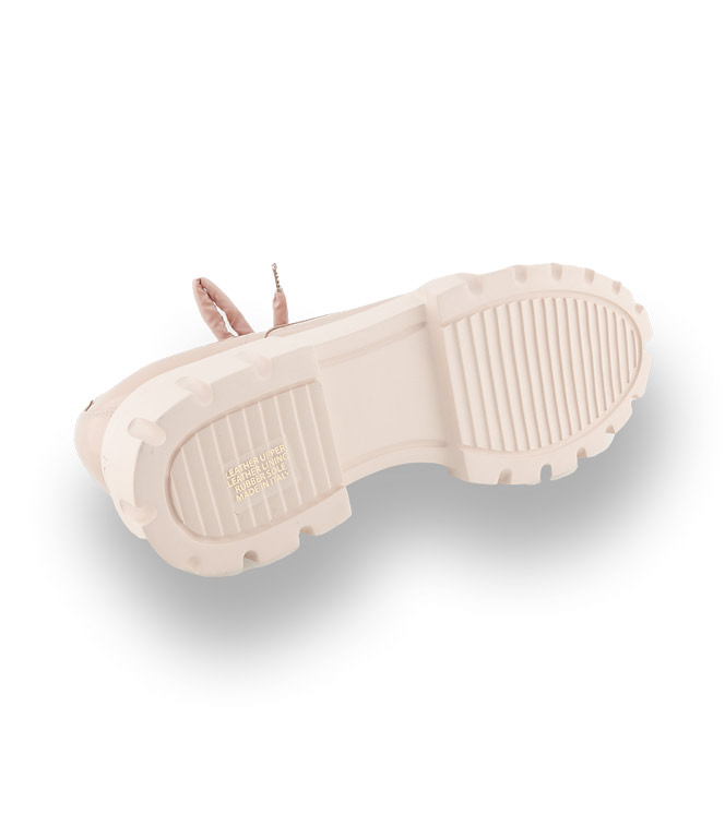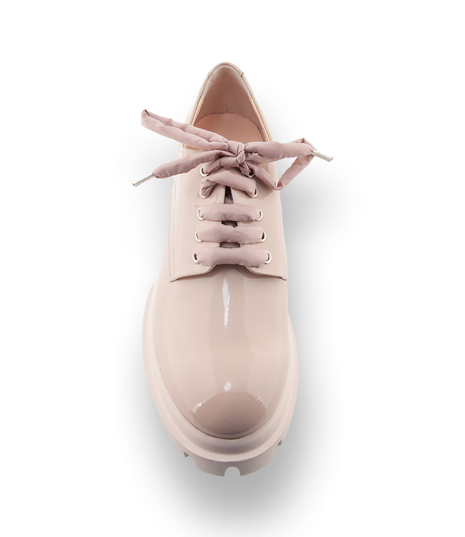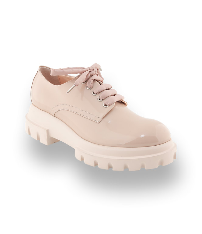 Die perfekte Ergänzung zu voluminösen Jacken sind Schnürschuhe, wobei die Sohlen nicht dick und derb genug sein können. Ein starkes Modethema setzt Attilio Giusti Leombruni gekonnt um. Aus edlem nudefarbenen Kalbslack mit einer Sohle aus Naturkautschuk von 3,5 auf 6 cm peppen Sie ihren neuen Streetstyle.
