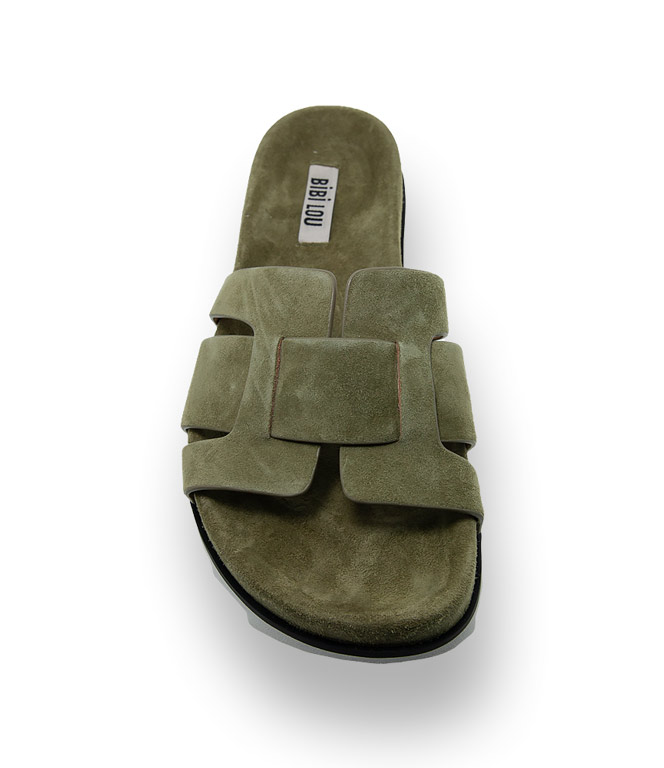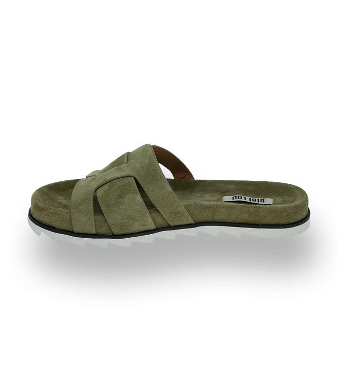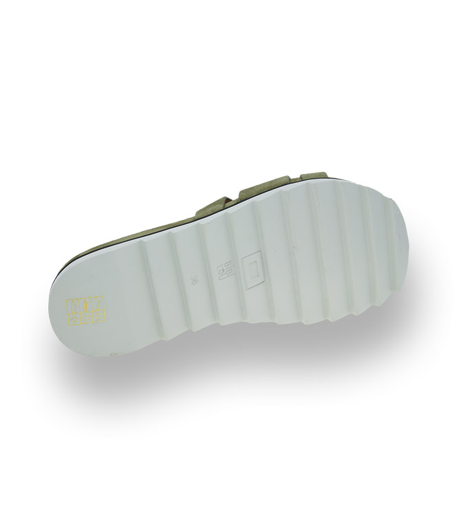 Die markante Anordnung der Lederbandagen in weichem grünem Velour, bieten sicheren Halt. Das gepolsterte Lederfußbett und die flexible Haifischsohle verwöhnt ihre Füße an heißen Sommertagen. Die sportliche Pantolette lässt sich wunderbar kombinieren.