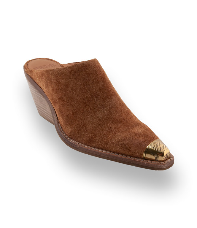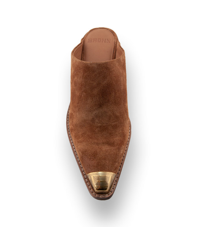 Die Sabots von Bronx mit Wild West Charakter sind die perfekten Sommerbegleiter für dieses aussagekräftige Trendthema. Aus naturfarbenen Wildleder, ein Hingucker die goldfarbene Metallkappe und der 7cm hohe konische Absatz perfektionieren den Westernlook. Ein Stilmittel für unbeschwerte Sommertage.