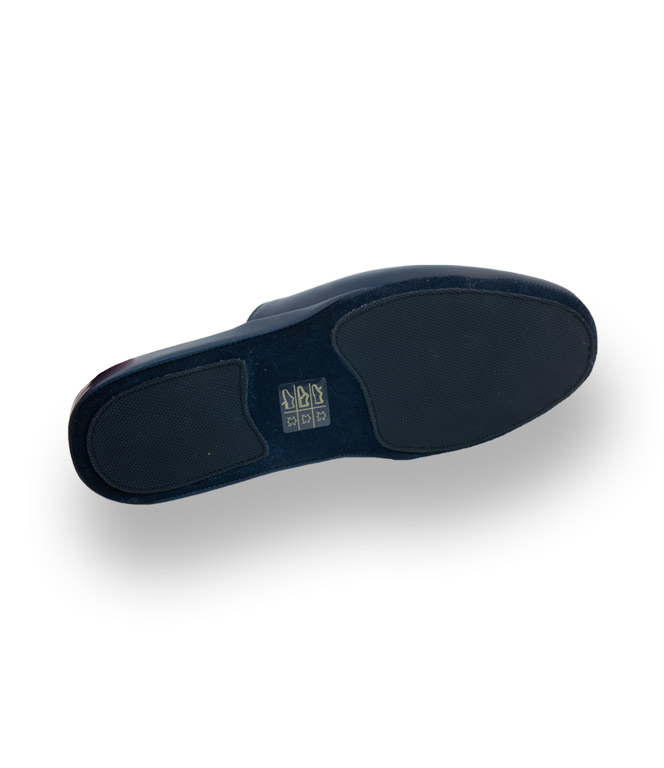 Der Pantoffel ist aus butterweichem blauem Leder gefertigt. Die gepolsterte Decksohle und der kleine Keil sorgen für ein Wohlfühlerlebnis. Die flexible Chromledersohle hat Gummieinsätze im Absatz- und Sohlenbereich. Rutschsicherheit ist somit garantiert.