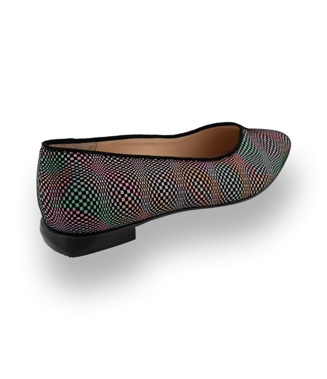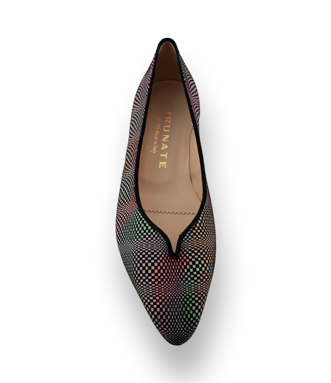 Bunter Ballerina von BRUNATE aus Kalbsveloursleder in spitzer Form findet den idealen Einsatz. Durch ein herrlich dezentes Farbspiel im wellenartigen Karomuster bekommt der Klassiker von Brunate ein modisches Upgrade. Geschmeidiges Lederfutter und eine Lederlaufsohle unterstützen den Tragekomfort auch an heißen Tagen.