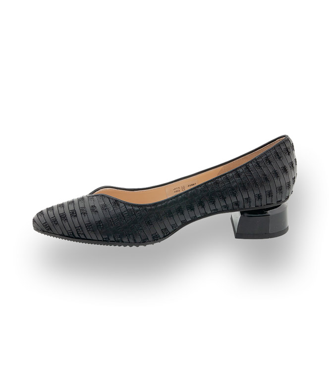 Ein Modell dass sich immer wieder in neuen interessanten Prints präsentiert. Ein Klassiker in Schwarz aus Ziegennappa zeigt sich im zierlichen Streifenmuster. Ein hochwertiges Lederfutter und eine flexible rutschsichere Gummilaufsohle sorgen für enormen Tragekomfort. Spiegeleffekt am 3cm hohen Kunststoffabsatz perfektionieren das Modell.