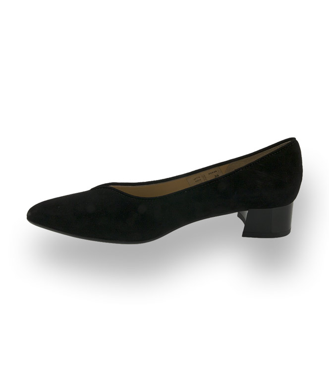Der spitze Highcutpumps mit V-Ausschnitt, in schwarzem Velour, lässt keine Wünsche offen. Hochwertiges Lederfutter, die Gelenkstütze und die Lederlaufsohle garantieren ein Wohlfühlerlebnis. Der 3 cm hohe, unempfindliche, hochglänzende, schwarze Kunststoffabsatz komplettiert den edlen Look.