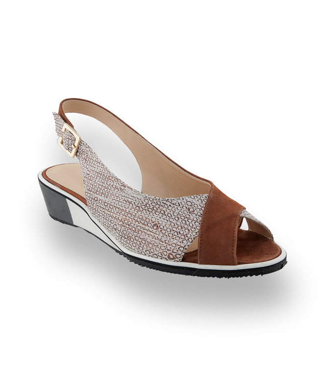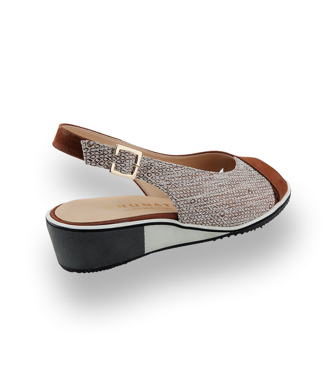 Diese Sandalette gewinnt an Charme durch den beige, mit goldfarbenem Druck Ledermix. Die Keilsandale von Brunate wird zum Lieblingsbegleiter für unbeschwerte Stunden. Wedges aus geschäumten Gummi perfektionieren den lässigen Style. Mit hochwertigen Futterleder in gewohnter Premium-Qualität von BRUNATE.