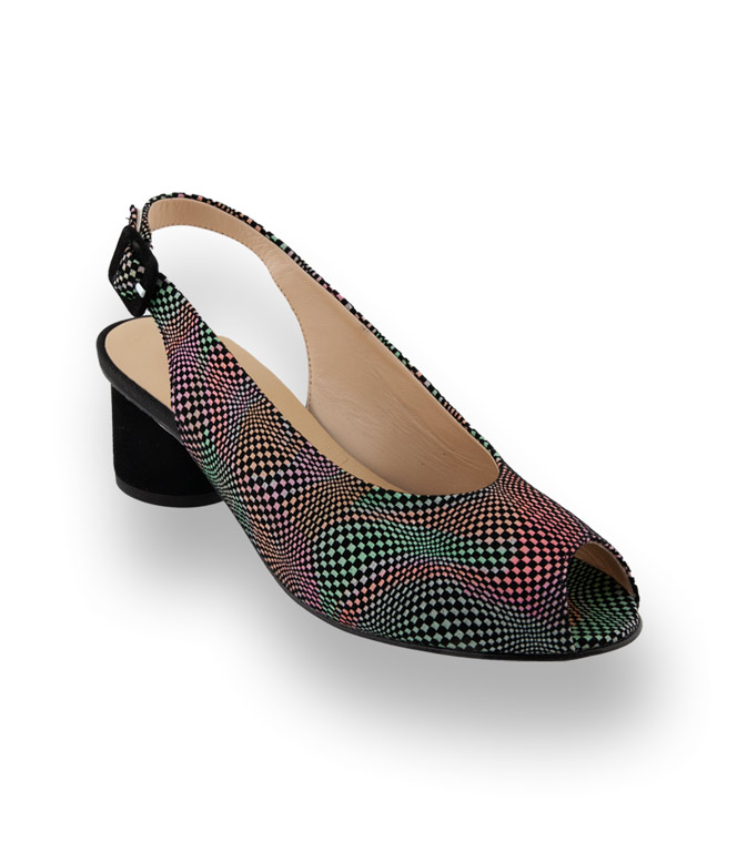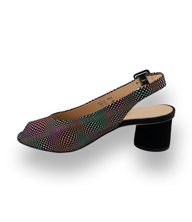Bunt aber dennoch sehr dezent gehaltenes Farbspiel auf weichem Veloursleder überzeugt in Qualität und Komfort. Auch für kräftigere Füße bestens geeignet, gehen Sie stilvoll in die warme Jahreszeit. Ein 4,5cm hoher Säulenabsatz aus schwarzem Veloursleder, Lederfutter und eine Lederlaufsohle unterstützen den Komfort. Eine Farbkombination die sich überall integrieren lässt.