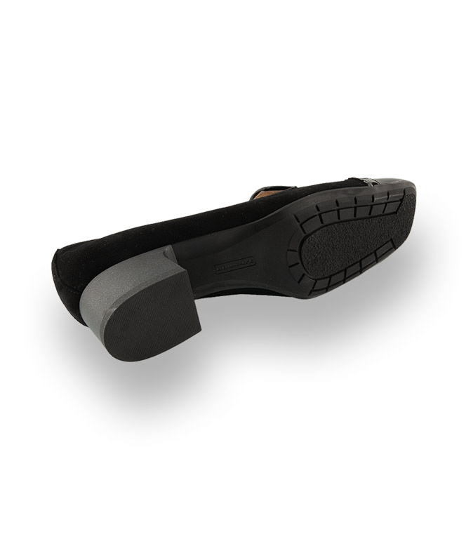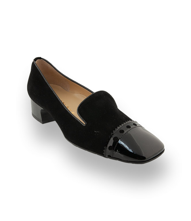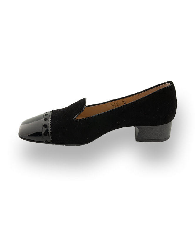 Der klassische Pumps aus weichem Velour wurde mit einer Lackkappe mit Zackenabschluss und schicker Lochung aufgepeppt. Die Einfassung aus Lackleder vervollständigt den eleganten Look. Angesagtes Karree und der unempfindliche, metallische Absatz, von 3 cm, werden sie begeistern. Hochwertiges Kalbslederfutter und die Gelenkstütze verwöhnt ihre Füße. Für eine sanften Auftritt sorgt die dämpfende Gummilaufsohle.