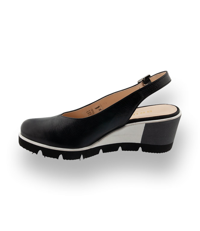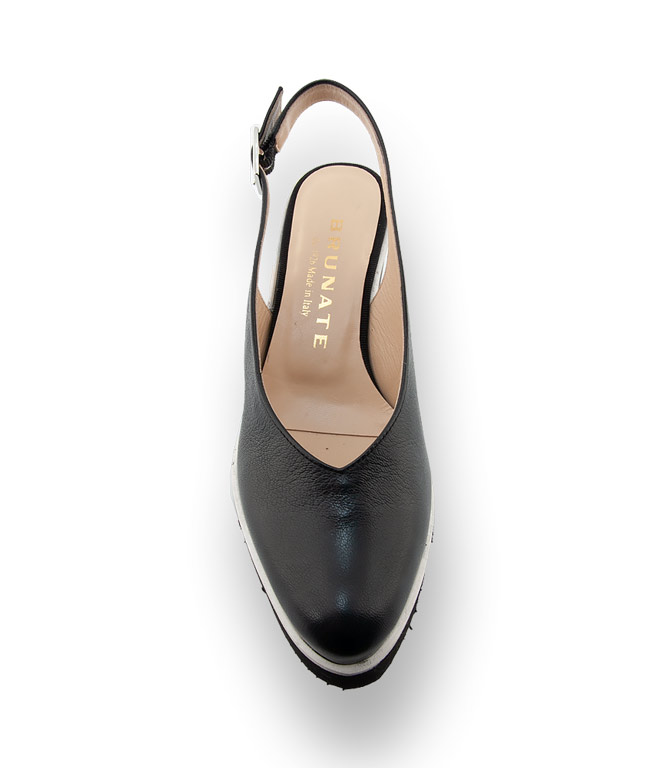 Der schwarze Slingback aus genarbten Leder von BRUNATE verspricht ausgezeichneten Tragekomfort. Ein 6cm hoher, extrem leichter Keil aus geschäumten Gummi in grau-weiss und der V-Ausschnitt der beste Passform auch für vollere Füße garantiert wird zum Lieblingsbegleiter. Reinschlüpfen und sich wohlfühlen.