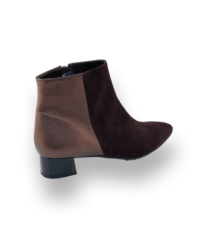 Edles Velour wurde mit braunen Metallicleder kombiniert. Die spitze Form zaubert eine feminine Silhouette. Der unempfindliche Absatz, aus glänzendem, schwarzem Kunststoff, ist chic und bequem. Die flexible, leicht profilierte Gummilaufsohle bietet Schutz vor Nässe und federt ihre Schritte sanft ab. Der Reißverschluss ermöglicht einen leichten Einstieg.