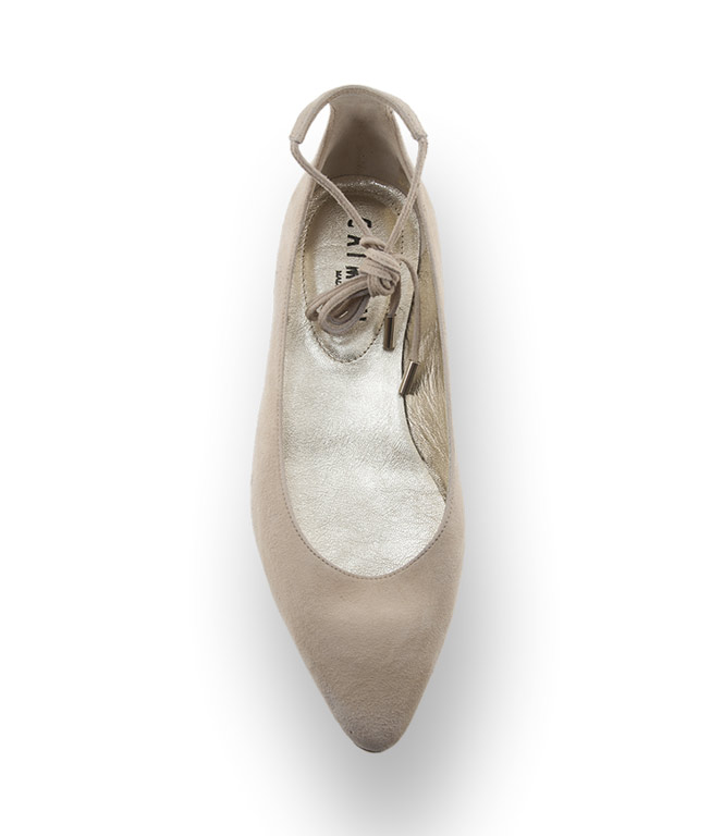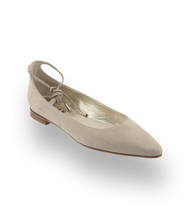 Flat - Modelle mit zarter Schnürung und mit einem schmalen Leisten lässt Sie schlank und groß aussehen. Der Ballerina von Caiman in einem hellen Beige aus feinstem Veloursleder wird durch ein goldenes Lederfutter veredelt. Lederlaufsohle sorgt für angenehme Tage auch bei höheren Temperaturen.