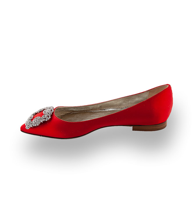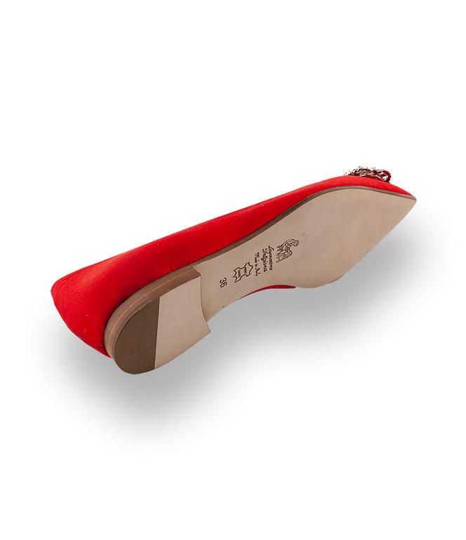 Satin ist unschlagbar glamourös. Caiman zeigt mit diesem rotem Ballerina: Flach kann auch Elegant. Edle Schmuckschnalle auf rotem Satin in spitzer Form ist nicht nur für Nachtschwärmer. Goldfarbenes Lederfutter und eine Lederlaufsohle in bester Verarbeitung zeichnet einen Schuh von dem italienischen Label CAIMAN aus.