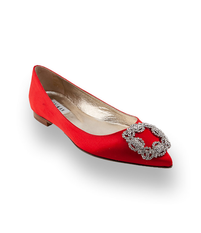 Caiman Ballerina in rot Satin mit silberfarbener Brosche