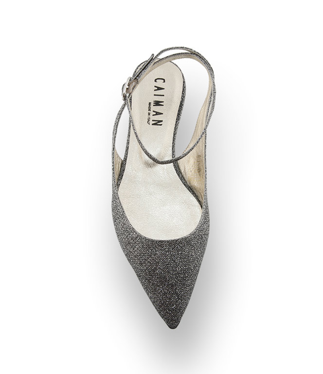 Stylischer spitzer Sling in anthrazit / silberfarbenem Lurex von Caiman.
