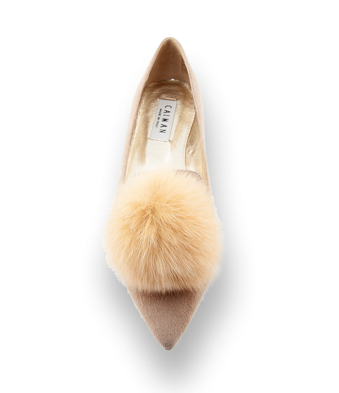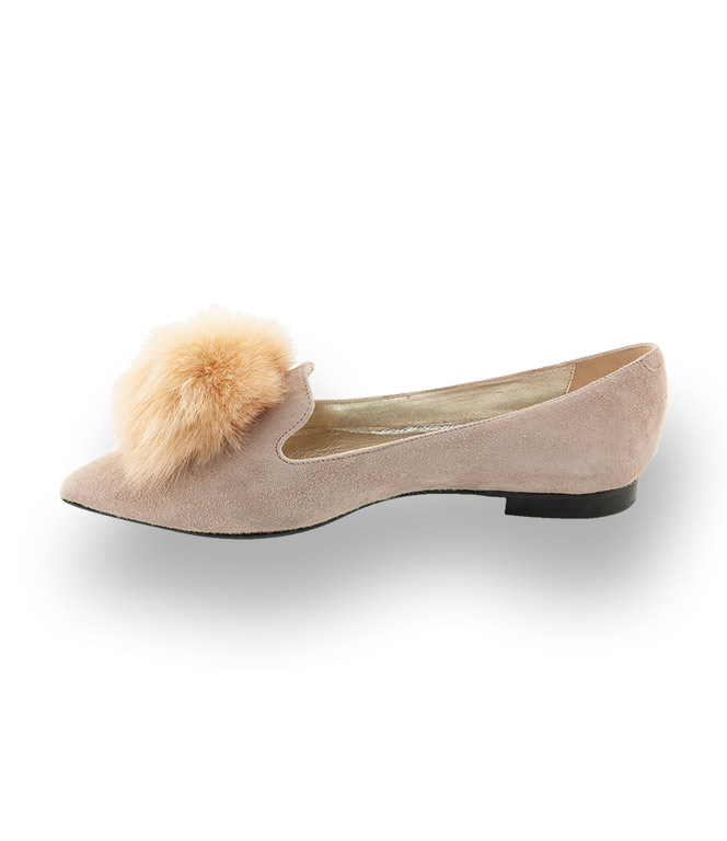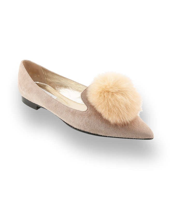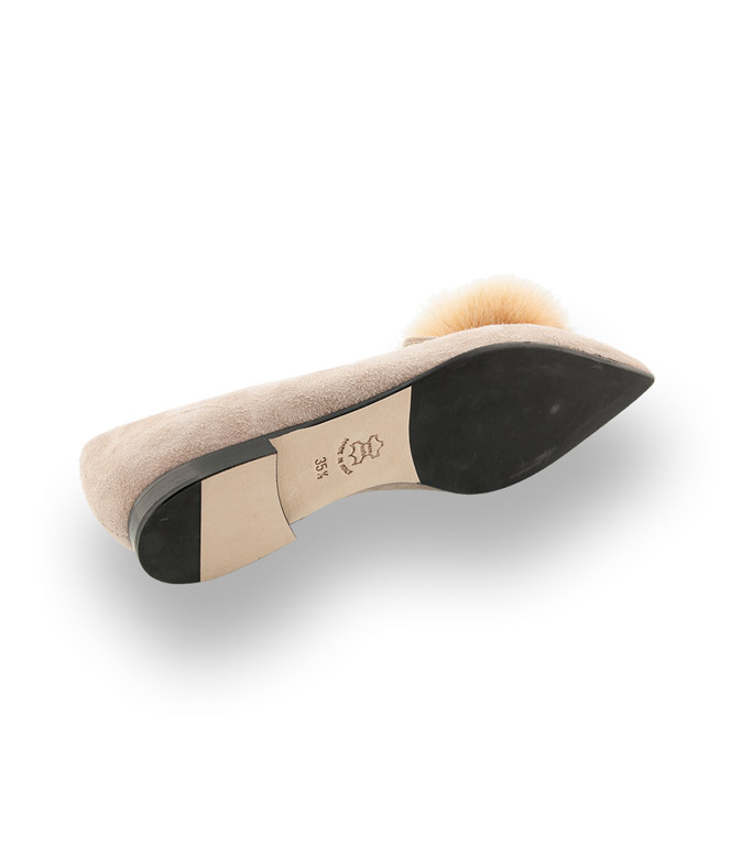Spitze Loafer aus beigem Veloursleder von Caiman bekommen durch mega Fellbommel einen starken Auftritt. Zierlich feminin mit edlem Touch. Hochwertiges Veloursleder goldfarbenes Lederfutter und eine Lederlaufsohle mit halber Gummisohle garantieren höchsten Komfort. Das italienische Label CAIMAN verführt durch alltagstaugliche, extravagante Flats die auf besondere Weise ihre Garderobe veredeln. Frauen die ausgefallene, flache Schuhe lieben, werden bei Caiman immer fündig.