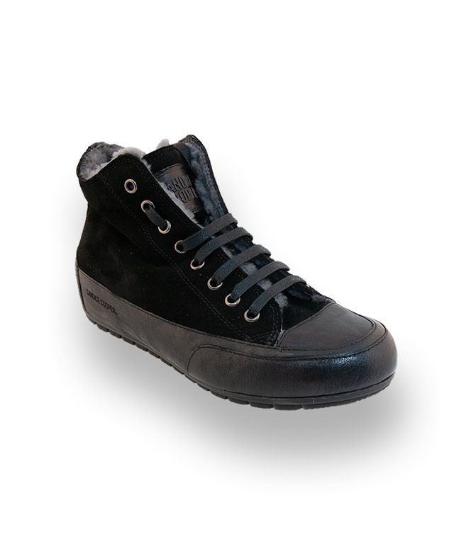 Schwarzes Veloursleder mit der typischen Sohle im schwarzem Leder ist nicht nur weich und bequem. Die kuschelige Lammfellfütterung sorgt für warme Füße und die Lammfelleinlage lässt sich austauschen. Candice Cooper Sneaker sind die perfekten Begleiter in allen Lebenslagen. Schnürung für die individuelle Weiteneinstellung und ein Reißverschluß für den schnellen Schlupf.