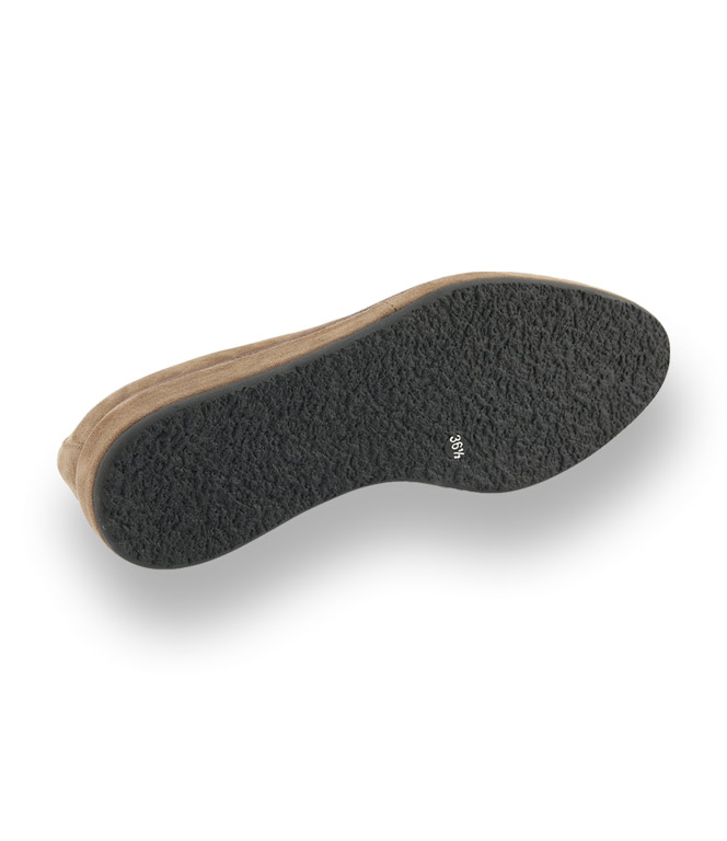 Aus hochwertigem Veloursleder mit einem 2cm hohem Keil wirkt verspielt und verleiht dem Slipper einen edlen Charm. Der dekorative Zierrahmen wird mit einer hellen Steppnaht aufgepeppt. Ein Futter aus weichem Ziegenleder erhöht den Tragekomfort und eine Gummilaufsohle lässt schlechtes Wetter zu.