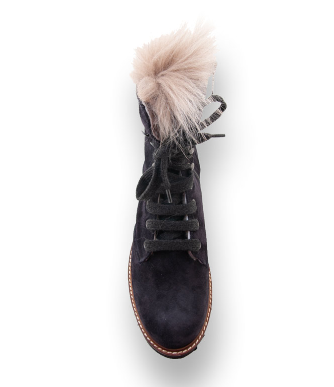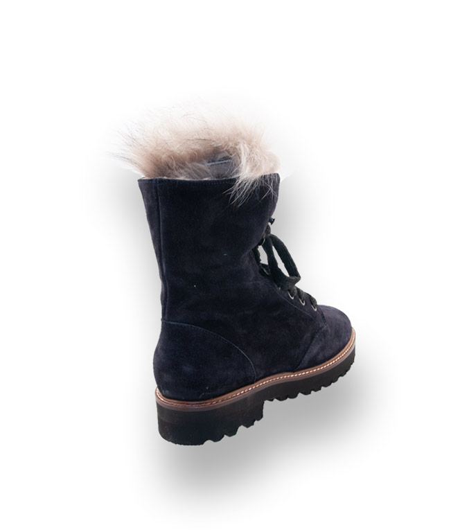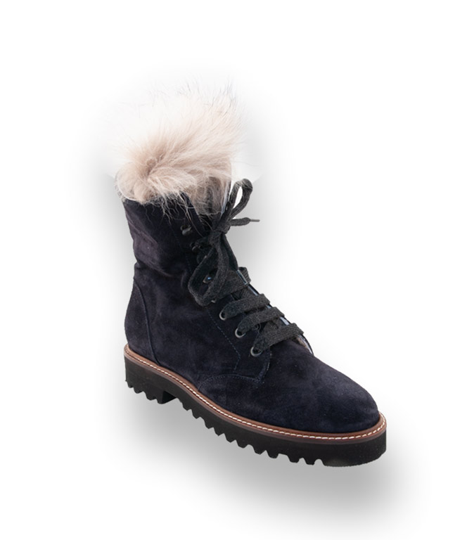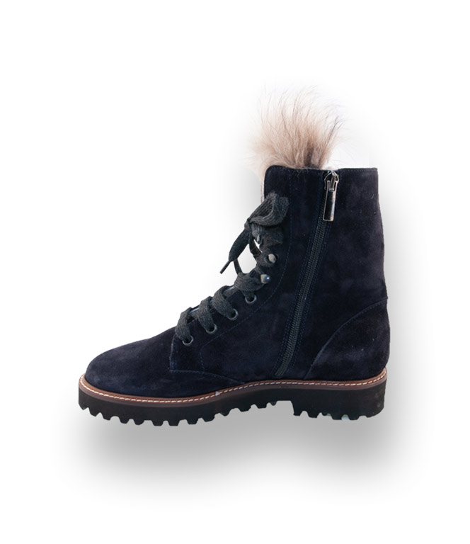 Mit dem dunkelblauen Bootie aus Veloursleder von Cenedella-Viamercanti werden frostige Tage modisch unterstützt. Ein Lammfellfutter von höchster Qualität wärmt ihre Füße und garantiert hohen Wohlfühleffekt. Der Schnürbootie mit silberfarbenen Ösen und einem Reißverschluss unterstützt den schnellen Ein-und Ausstieg. Herrlich leichte Vibramsohle mit Profil sorgt für Bequemlichkeit. Ein dekorativer brauner Zierrahmen und vorallem Fell an der Zunge peppt den modischen Style.