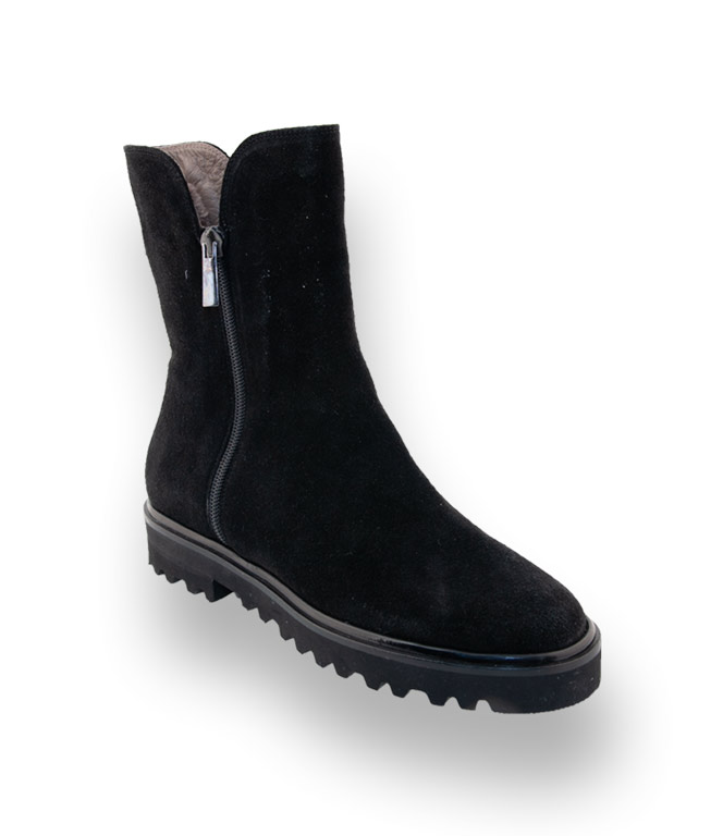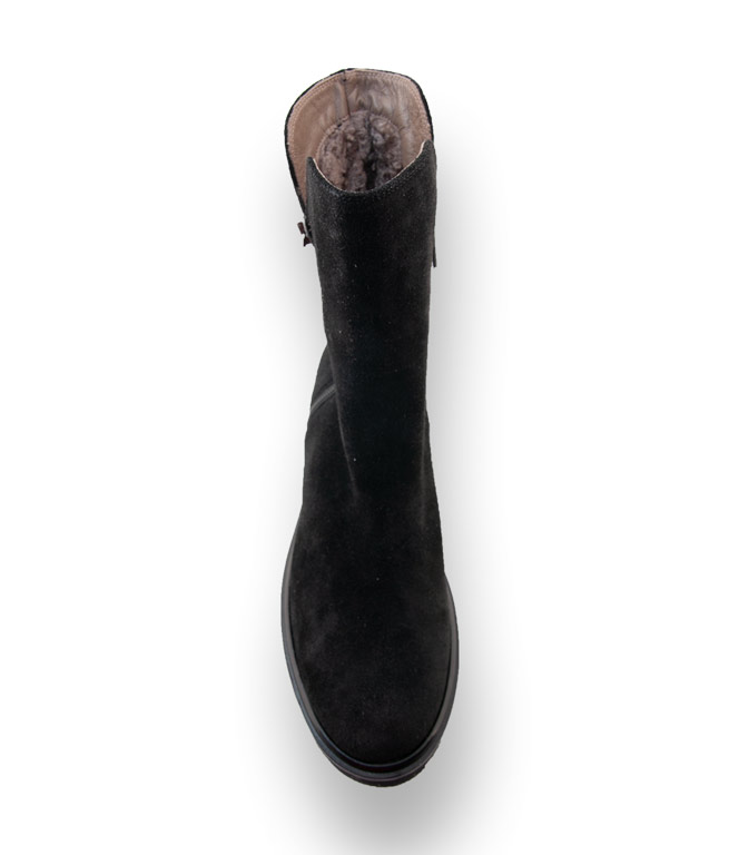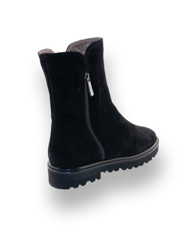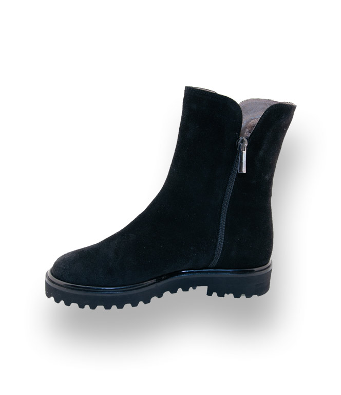 Die schwarze Stiefelette aus hochwertigen Veloursleder ist mit Lammfell gefüttert. Nichts wärmt so sehr wie ein Lammfellfutter. Cenedella Viamercanti ein Spezialist für handgefertigte Schuhe aus Italien verwöhnt Sie durch Qualität und Design. Eine megaleichte Vibramsohle mit markanten Profil bietet enormen Tragekomfort. Gleich zwei Reißverschlüsse sorgen für einen bequemen Einstieg.