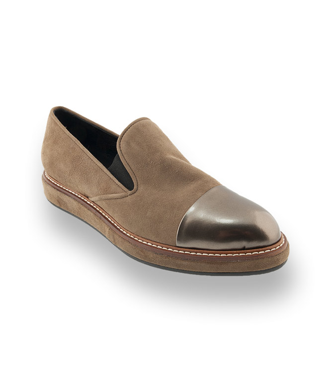Trotz des Detailreichtums bleiben die Kreationen von Cenedella der unkomplizierten Linie treu. In beige velours und einer Kappe aus Metallic-Leder bekommt dieser Slip On seinen peppigen Auftritt. Der braune Zierrahmen wirkt durch die helle Steppnaht besonders erfrischend. Für die hohe Bequemlichkeit sorgt der leichte und sehr weiche Gummiboden. Cenedella ist es gelungen aus bestem Material mit Lederfutter in schöner Verarbeitung einen schicken sportlichen Slipper zu kreieren.