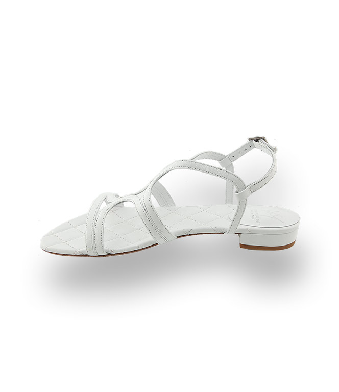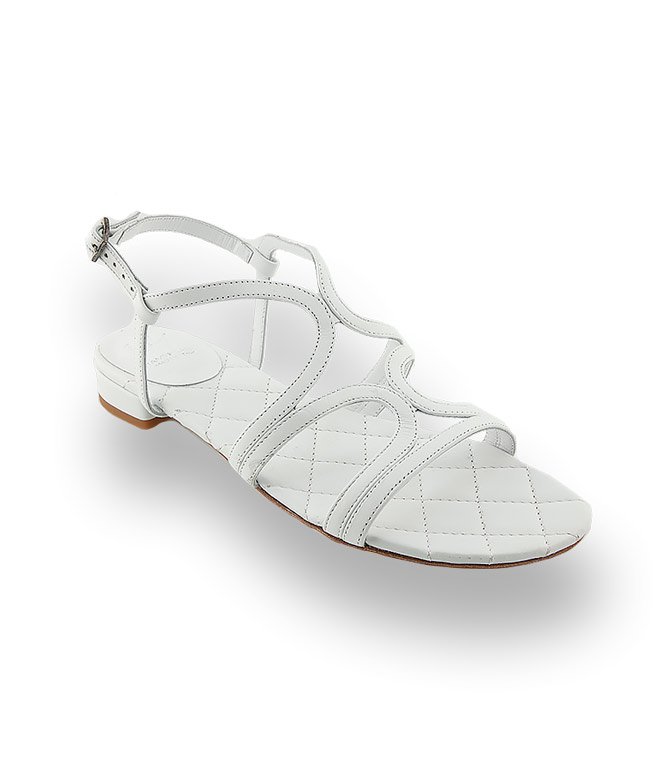 Edelste Materialien machen die sommerlichen Flachen zu modischen Highlights für höchste Ansprüche. Weißes Kalbsleder und die extravagante Riemchenführung sorgen für Aufregung und setzen gebräunte Beine gekonnt in Szene. Die filigranen Riemchen bieten sicheren Halt. Die gesteppte Lederdecksohle ist ein weiteres Indiz für die detailverliebte Verarbeitung. Ein funkelnder Schmuckstein, das Markenzeichen von Viamercanti Cenedella, schmückt die Lederlaufsohle.
