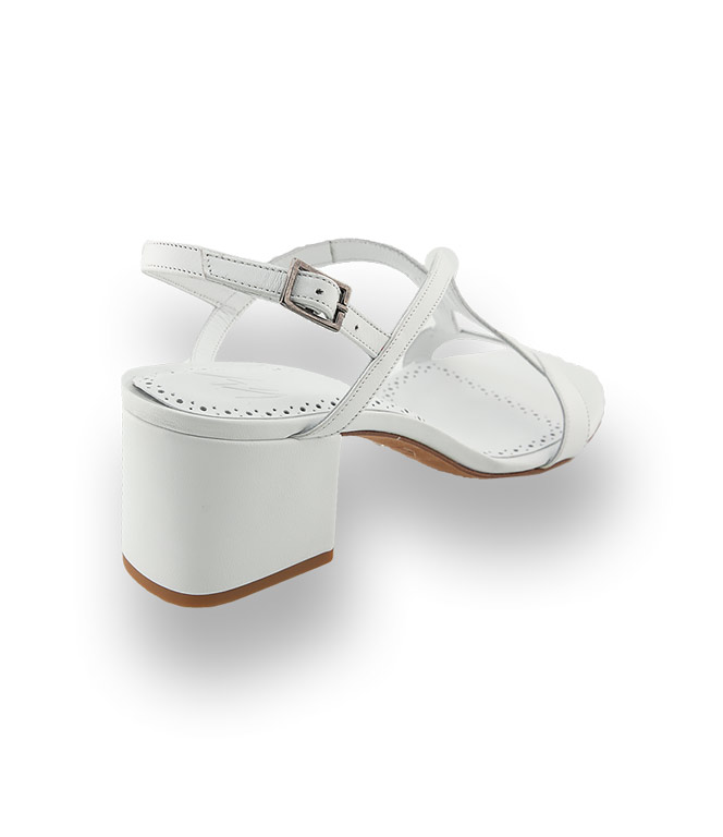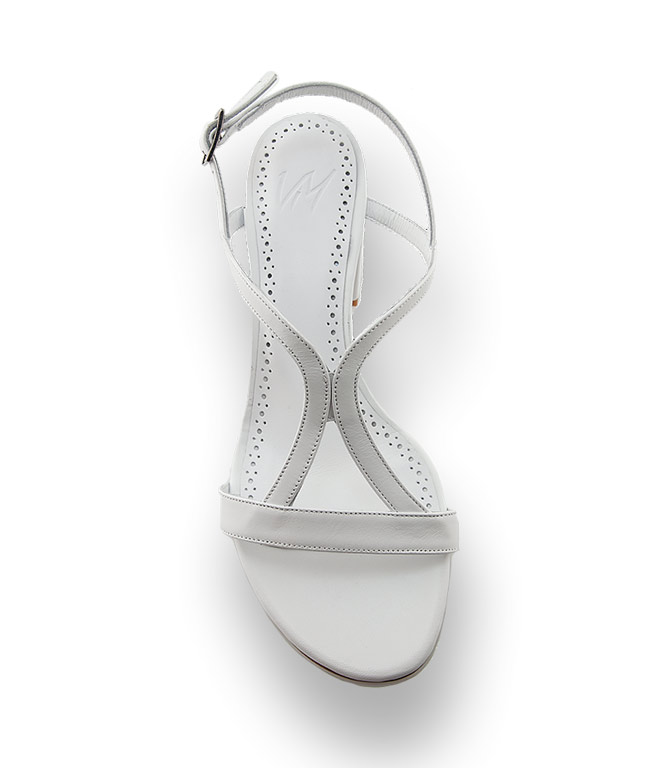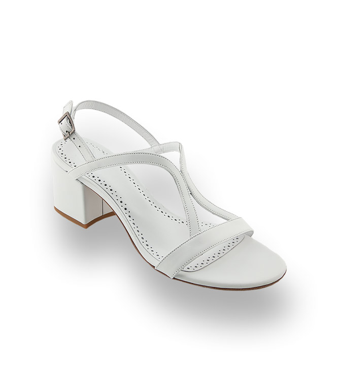 Weiches Kalbsleder in filigranen Riemchen machen die weiße T-Strap Sandale zu einem Hingucker. Die extravagante Riemchenführung sitzt wie angegossen und streckt das Bein. Der blockige 5 cm hohe Absatz unterstreicht den klassischen Look. Die Lederlaufsohle schmückt ein versteckter, funkelnder Schmuckstein, das Markenzeichen von Cenedella.