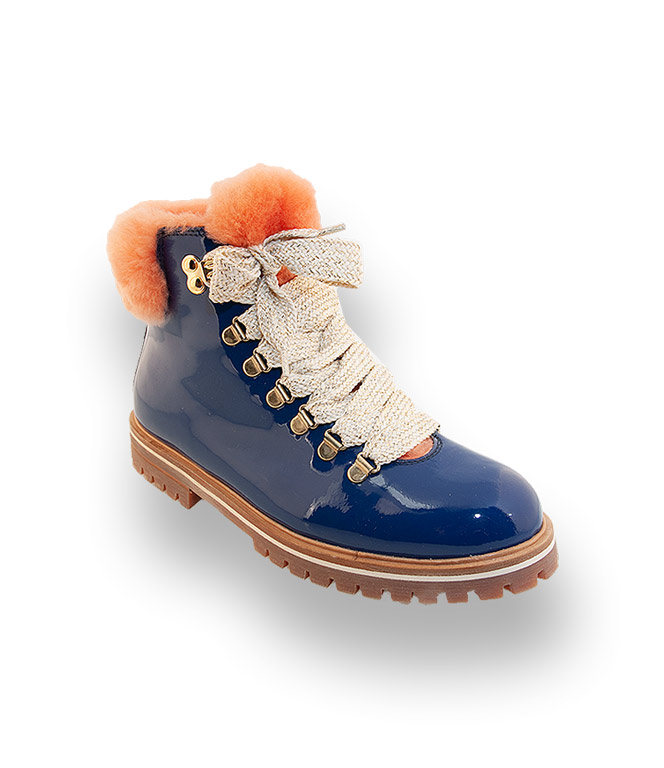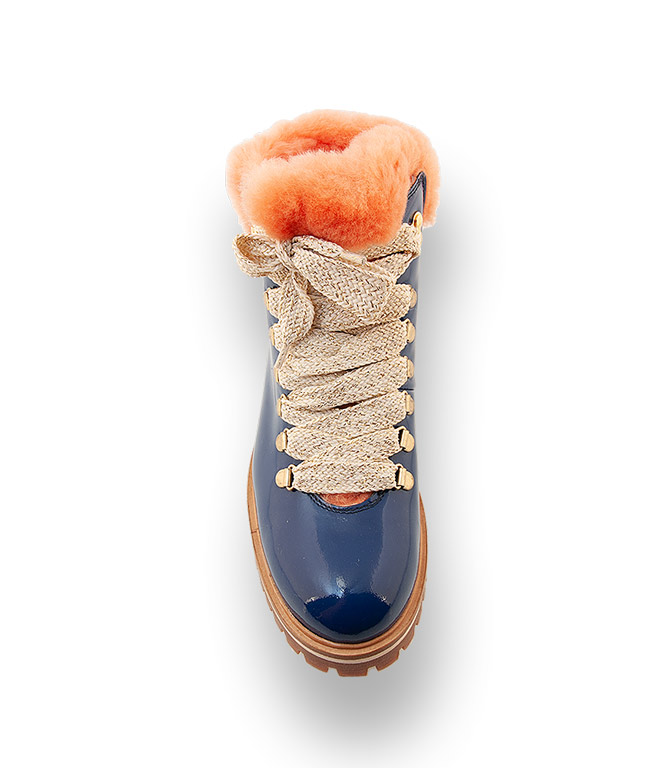 Der stylische Schnürstiefel lässt sie graue Wintertage vergessen und Frieren wird zum Fremdwort. Unempfindliches Lackleder wurde mit kuscheligem Lammfell, in frechem orange, in Szene gesetzt. Goldfarbene Ösen und golddurchwirkte Schuhbänder runden das Gesamtbild harmonisch ab. Die helle profilierte Gummilaufsohle mit sichtbarem Rahmen und cremefarbenem Einsatz sorgt Rutschsicherheit.