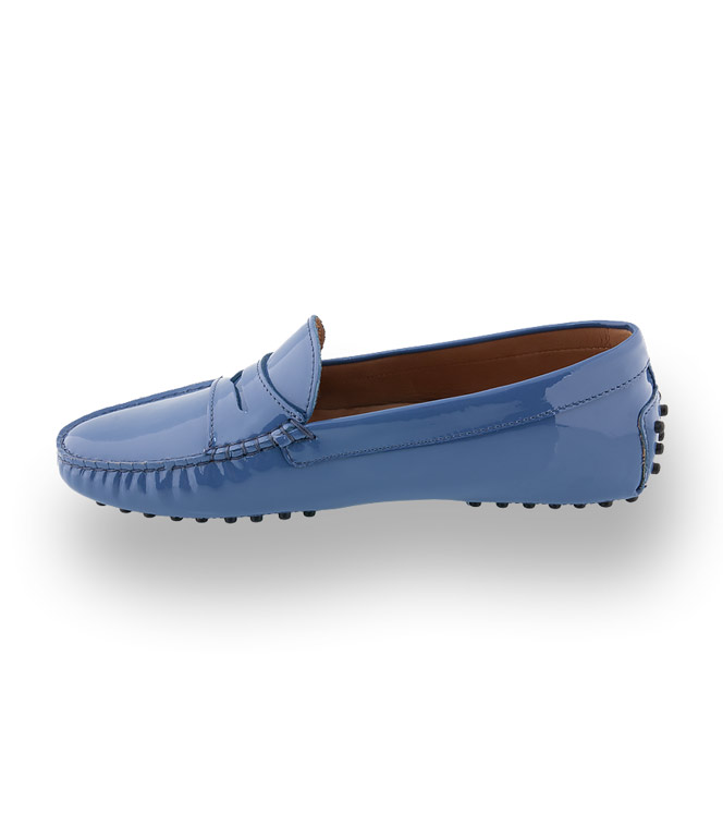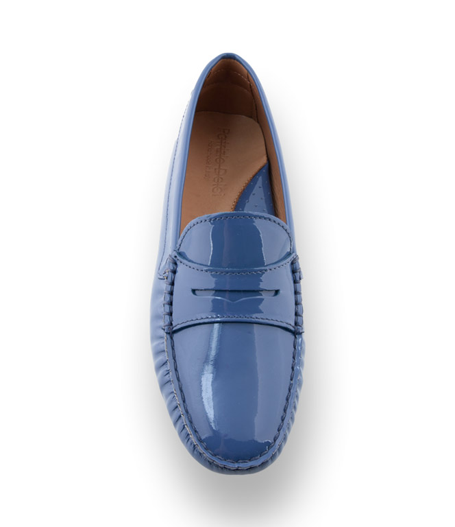 Klassischer Mokassin von Patrizio Dolci in blauen Lackleder mit Gumminoppen als Laufsohle. Die bequeme, flexible Noppensohle und der versteckte 1 cm hohe Keil im Fersenbereich, sorgen für traumhaftes Tragevergnügen. Der Damenschuh ist durchgehend ledergefüttert und mit einer farblich abgesetzten Gelenkstütze ausgestattet. Weiches, strapazierfähiges Lackleder in blau.