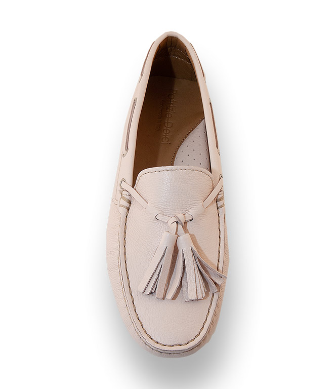 Mokassin von Patrizio Dolci aus feinstem Kalbsleder mit zwei Quasten in nudefarben. Die Farbpalette ist groß sie reicht von klassisch Schwarz Weiß bis zu aufregende Knallfarben. Wählen sie ihren Favoriten. Patrizio Dolci das italienische Label verbindet Chic mit Bequemlichkeit. In schöner Verarbeitung mit einem weichen Lederfutter, einer extrem flexiblen Noppensohle und einem 1cm hohen versteckten Keil verwöhnen Sie ihre Füße. Farblich abgestimmt zeigt sich die Gelenkstütze und die Noppen an der Laufsohle. Zeitlos, unkompliziert mit hohem Tragekomfort.