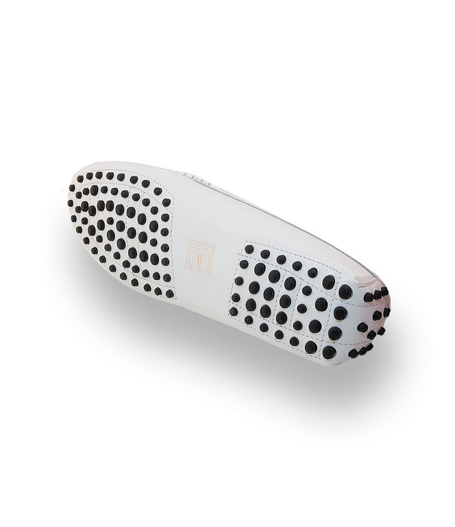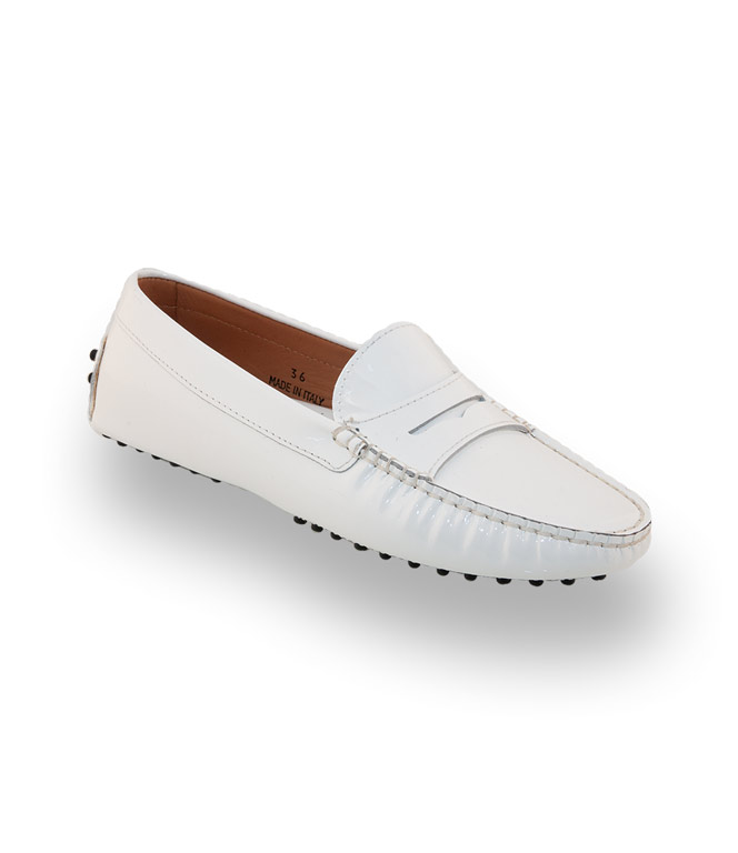 Klassischer Mokassin von Patrizio Dolci in weißen Lackleder mit Gumminoppen als Laufsohle. Die bequeme, flexible Noppensohle und der versteckte 1 cm hohe Keil im Fersenbereich, sorgen für traumhaftes Tragevergnügen. Der Damenschuh ist durchgehend ledergefüttert und mit einer farblich abgesetzten Gelenkstütze ausgestattet. Weiches, strapazierfähiges Lackleder in weiß.