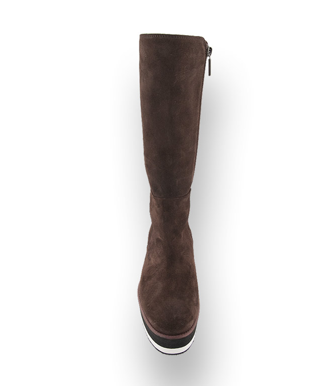 Breite Blockstreifen, plakative Rautenmuster da wirkt der braune Stiefel von Patrizio Dolci besonders aufregend. Die markante schwarz weiße Sohle steht im Fokus. Schöne Qualität aus hochwertigen Veloursleder und Lederfutter. Ein Reißverschluss sorgt für einen angenehmen Einstieg und der Plateau von 3 auf 4cm erhöht den Tragekomfort.