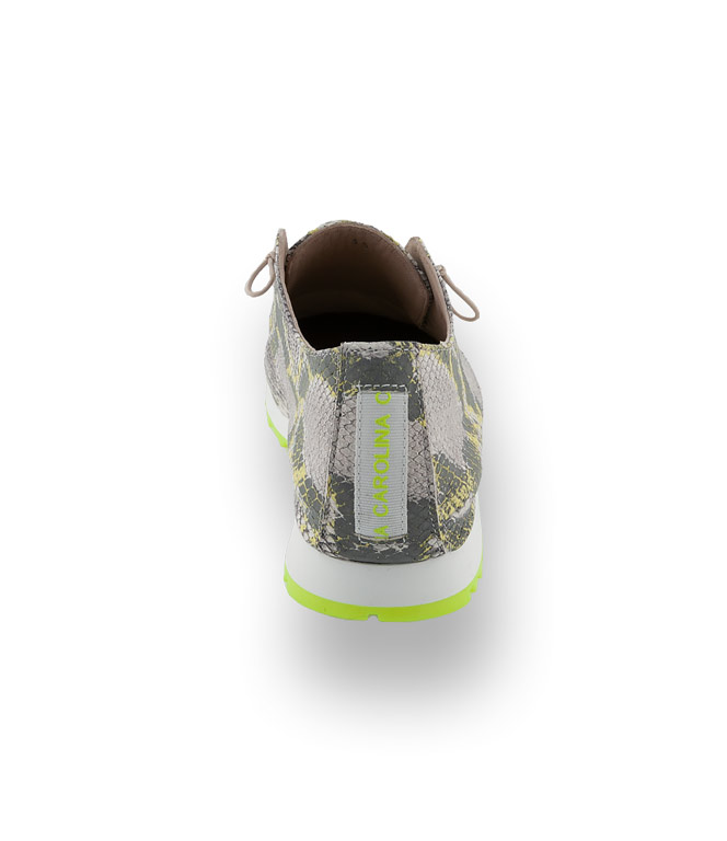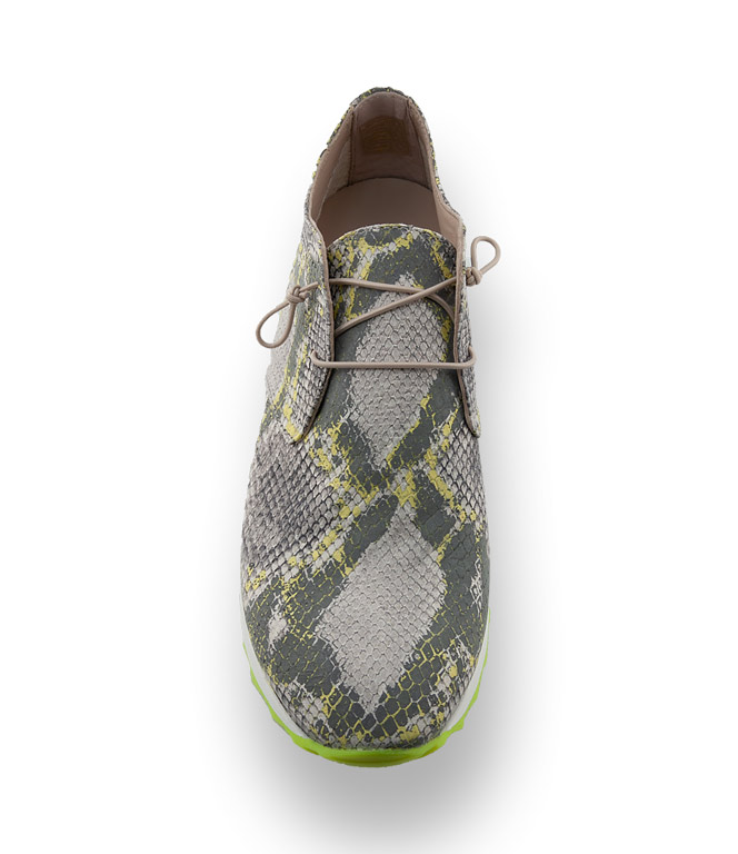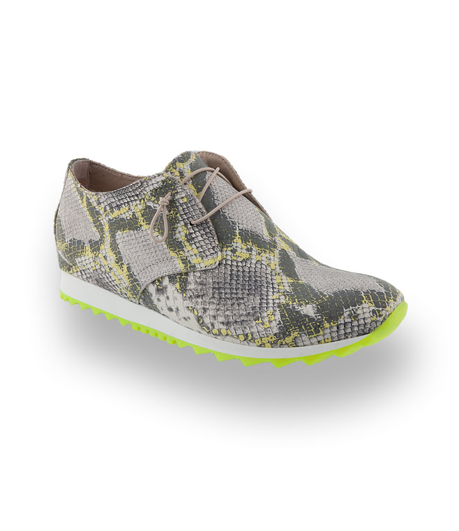 Ein absoluter Blickfang ist die modische Kombination aus gelb/grau und silberfarbenem Reptilprint ergänzt mit einer fexiblen Haifischsohle in Neongelb. Der Sneaker ist nur teilweise gefüttert, dies macht ihn zu einem äußerst anschmiegsamen Alltagsbegleiter. Der elastische, geknotete Schnürsenkel ist ein attraktives Detail. Die angenehme Polsterung der herausnehmbaren Innensohle ist ein Garant für höchsten Tragekomfort.