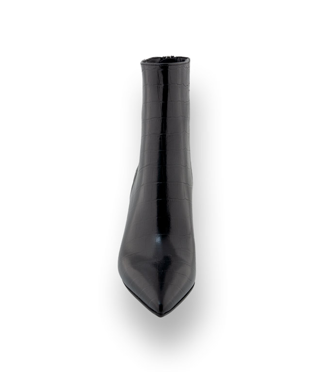 Die schwarze Stiefelette von Evaluna aus Kalbsleder in Krokoprägung wird zum perfekten Stilmittel und rückt die Weiblichkeit in den Fokus. Damenhafte Kostüme, lässige Mäntel aus groben Tweed, Hosen mit hohem Bund sowie fließende Kleider. Ein perfekter Begleiter für ihren femininen Style. Ein 8cm hoher Stiletto-Absatz, spitze Kappe und ein Reißverschluss an der Ferse komplettieren den Look. Hochwertiges Lederfutter und eine Kunststoffsohle die vor Nässe schützt, erhöht den Tragekomfort.