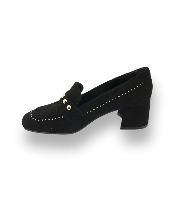 Der neue Retro-Look gewinnt an Fahrt. Blockabsatz und Karree darf nicht fehlen und geben ein fantastisches Bild ab. Bei Evaluna bekommen die modischen schwarzen Trotteurs aus Veloursleder goldfarbenen Nieten. Ein 4cm hoher Blockabsatz sorgt für Bequemlichkeit und das Innenfutter aus weichem Leder erhöht den Tragekomfort. Die neuen Loafer wirken besonders hübsch zur Midi-Länge. Eine Laufsohle aus Kunststoff mit rutschsicheren Gummieinsatz ist auch an nassen Herbsttagen geeignet. Beste Qualität mit weichem Lederfutter ausgestattet gehen Sie modisch in die neue Saison.