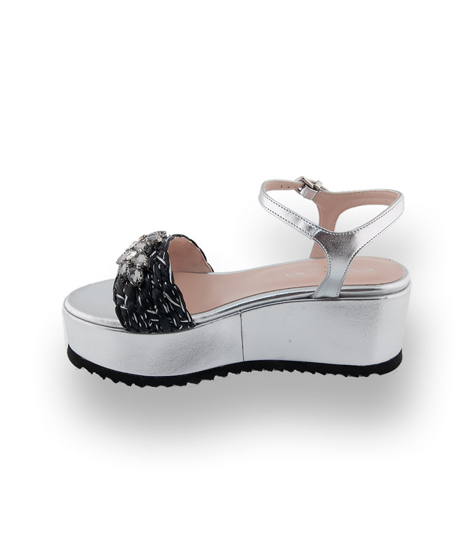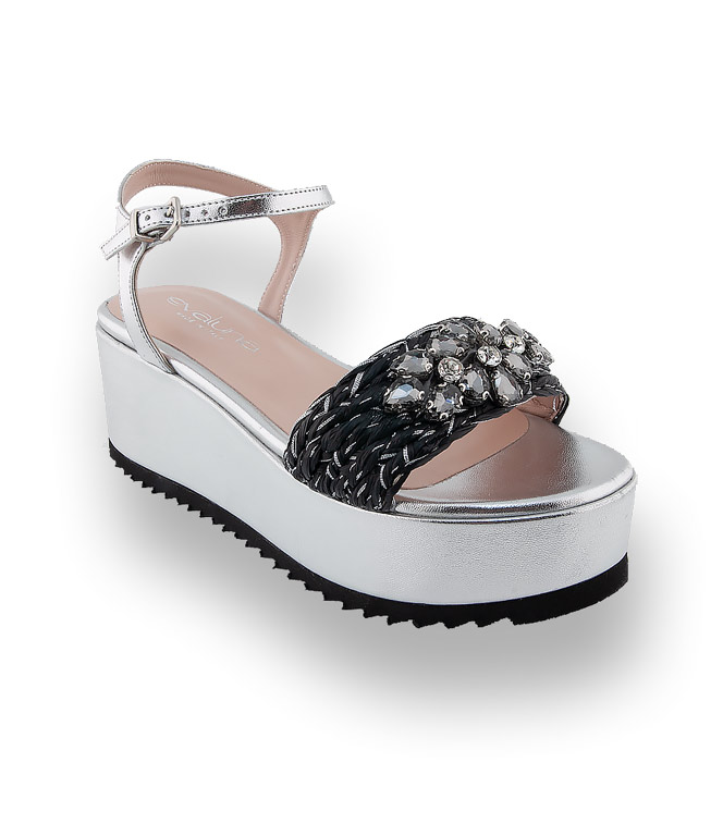 Plateau-Sandalen sorgen für einen optimalen Auftritt und machen lange Beine. Evaluna verwendet hochwertige Materialien in bester Verarbeitung. Silberfarbenes Ziegenleder, Lederfutter und ein Gummiprofil an der Laufsohle perfektionieren den Tragekomfort an heißen Tagen. Schwarze Bastflechtung mit silberfarbenem Lurex und Schmucksteine veredeln das Modell. Ein schicker Begleiter für ihr sommerliches Outfit wird zum Hingucker.