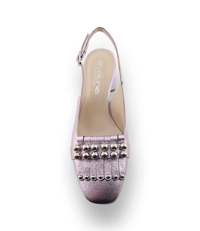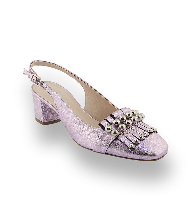 Die trendigen Fransen werden mit silberfarbenen Kugeln und Nieten, gekonnt in Szene gesetzt. Die modische Karreeform, FliederfarbenesMetallicleder, ein blockiger Absatz, sowie hochwertiges Lederfutter und die Lederlaufsohle garantieren einen hohen Tragekomfort. Lassen sie sich verzaubern - der aufregene Sling peppt jede Garderobe auf.