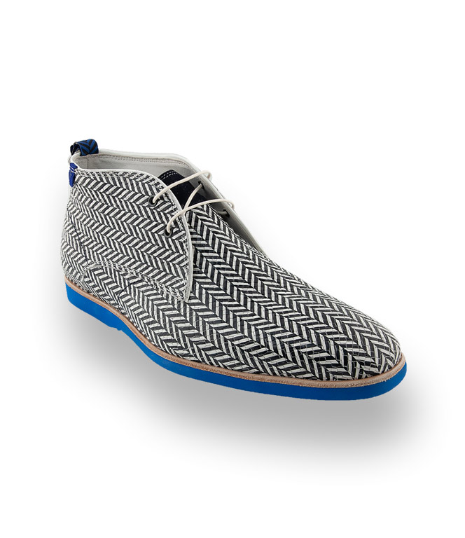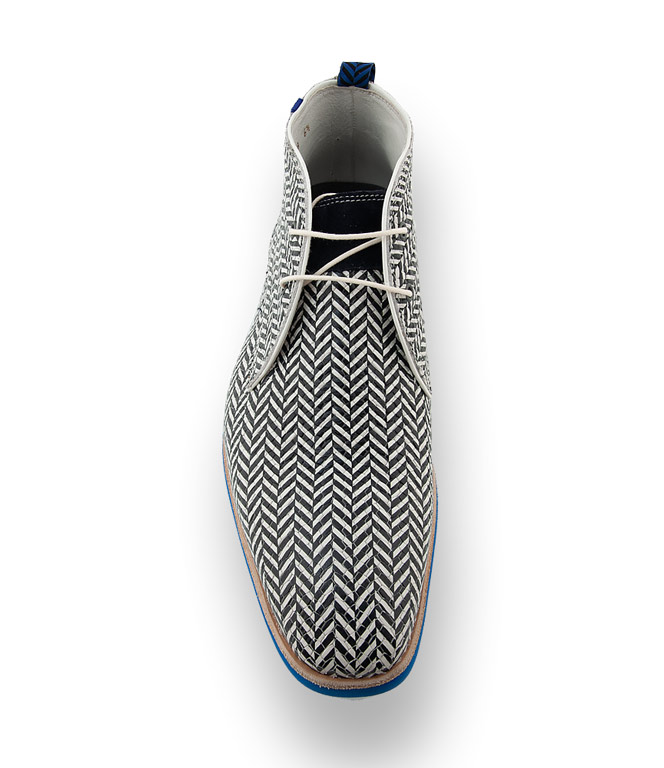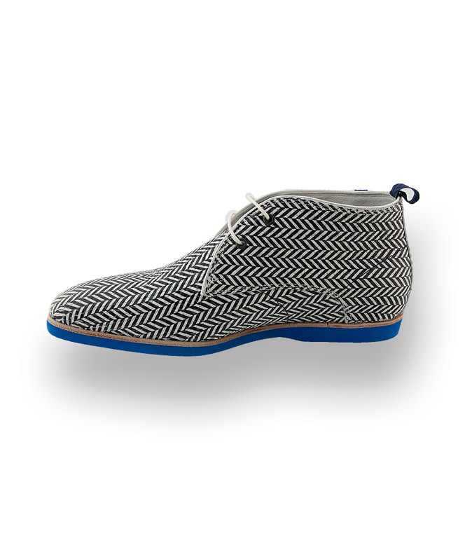 Im außergewöhnlichen Design in Top-Qualität zeigt sich der schwarz-weiße Desertboot von Floris van Bommel. Eine sehr leichte blaue Microsohle, hochwertiges Lederfutter und eine Lederdecksohle, die sich austauschen lässt, sorgen für hohen Tragekomfort.